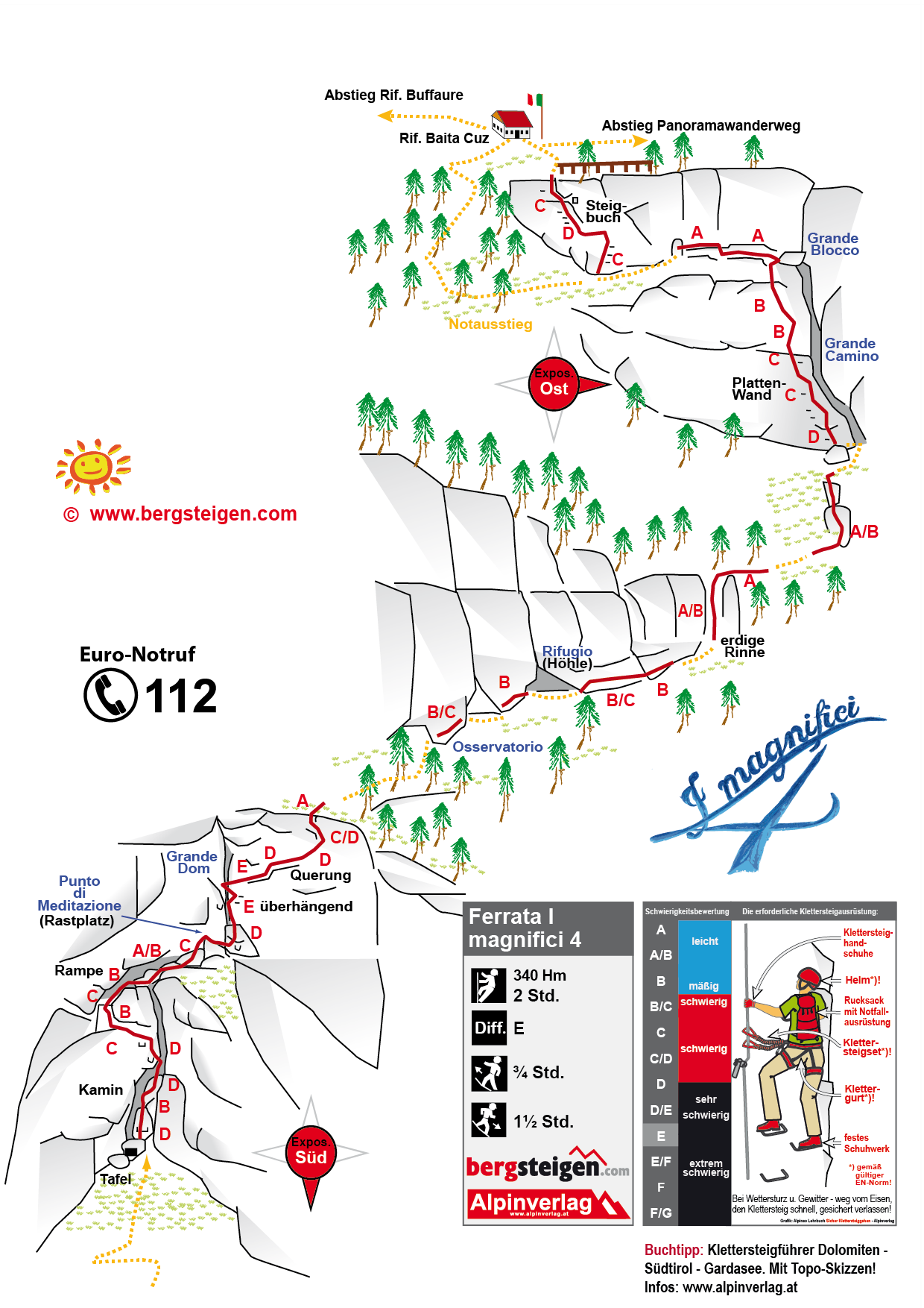 Diese kühne Ferrata im Val di San Nicolo ist vielleicht der schwerste Klettersteig der Dolomiten! Super Linienführung durch einen gigantischen Überhang und tolle landschaftliche Ausblicke machen diese Tour zum wahren Genuss für extreme Klettersteiggeher. Aber Achtung – unten im überhängenden „Dom“ wartet eine sehr knackige Schlüsselstelle. Wer die gemeistert hat, kann auf dem folgenden Band beim Verschnaufen den schönen Ausblick ins Val di San Nicolo genießen. Oben wird es dann nicht mehr so schwer. Beim Ausstieg steht man auf einer Art Aussichtsterrasse mit tollem Blick zu den benachbarten Gipfeln.