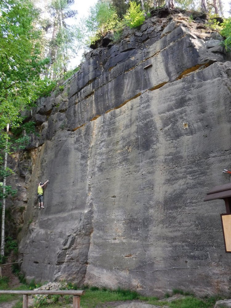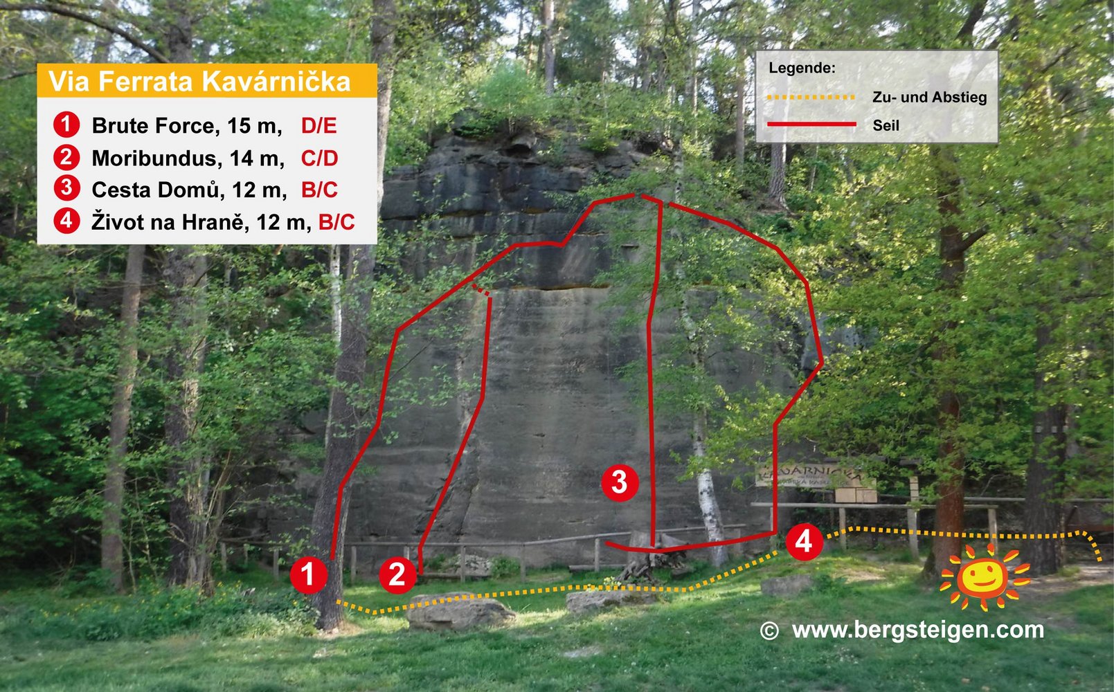 Die Route "Cesta Domů" dient als Abstiegsroute vom oberen Punkt mit einem Wandbuch. Im oberen Bereich gibt es die Möglichkeit, Kletterer im Steig zusätzlichem mit Seil Toprope zu sichern.