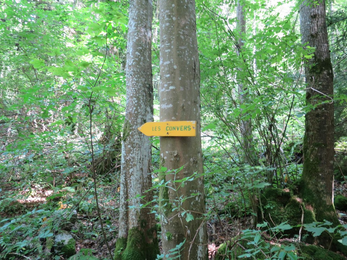 Vom Ausstieg (rote Tafel) quert man einen Weg nach Süden bis man auf den Weg "Les Convers" trifft. Diesem folgt man zum Einstieg und zurück zum Parkplatz.