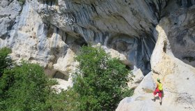 Siehe Topo! Anfangs eine lange teils absteigende Querung (A) bis in die großen Höhlen, danach wird es steiler (B) und am Schluss kurz (B/C).