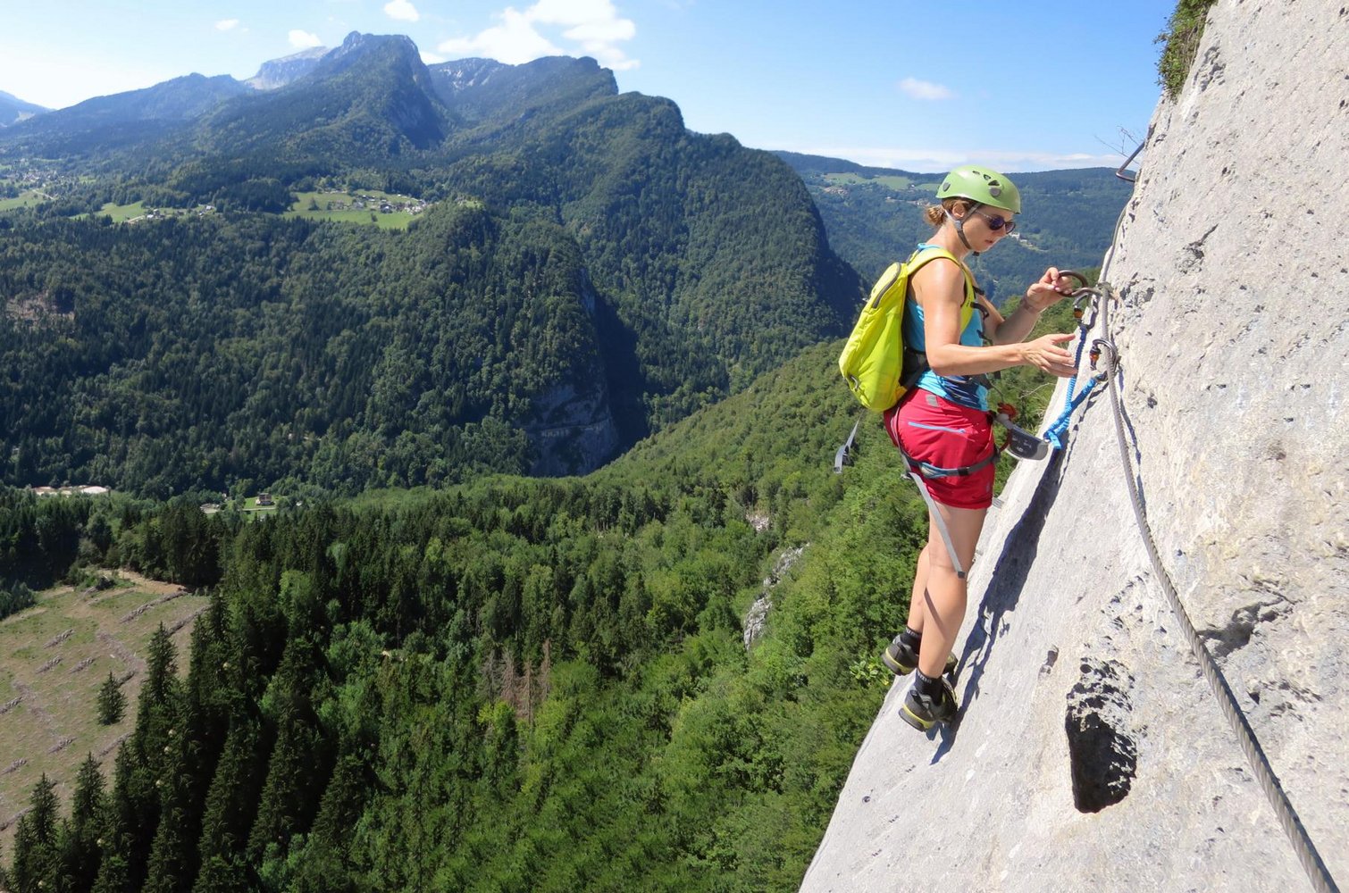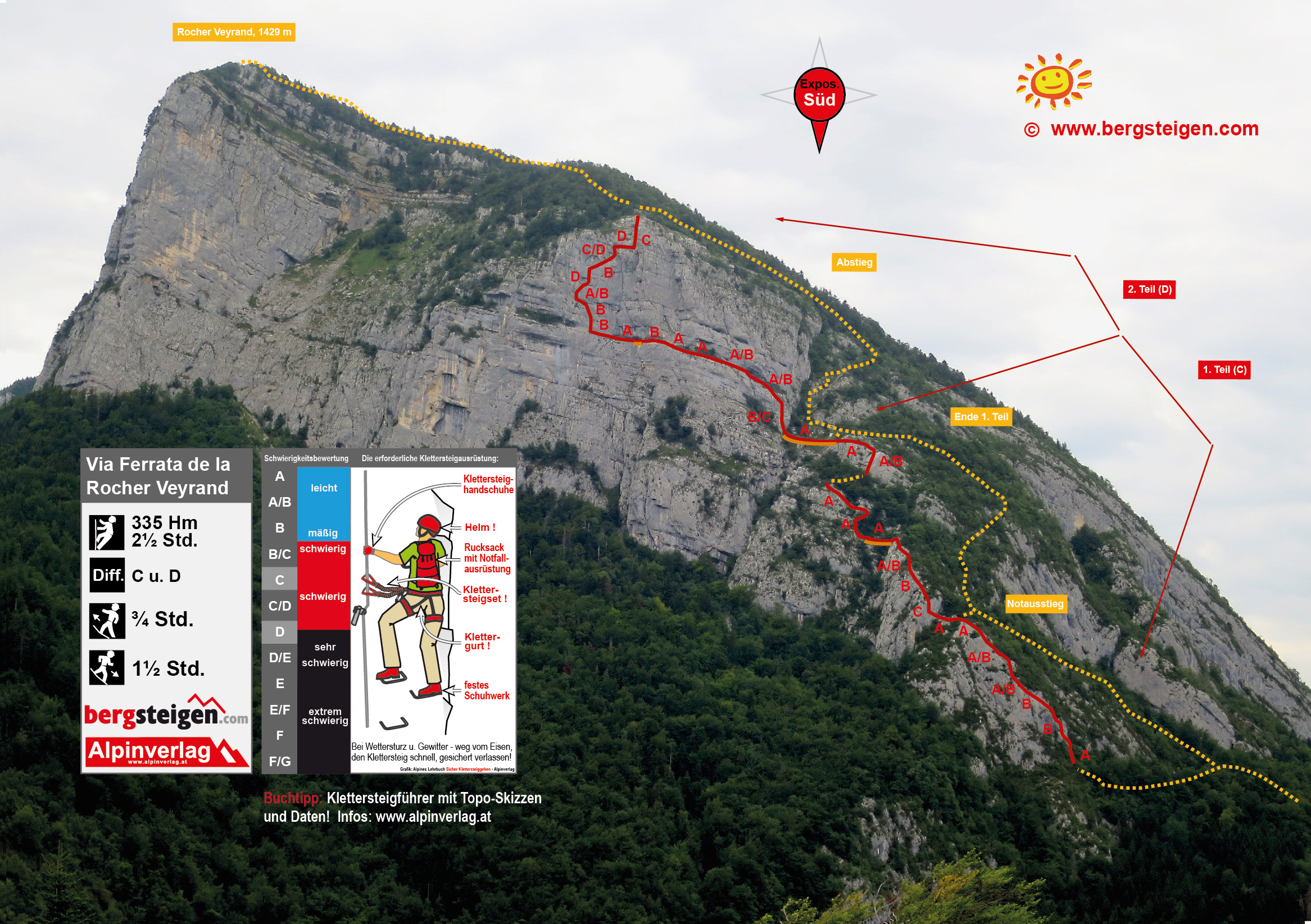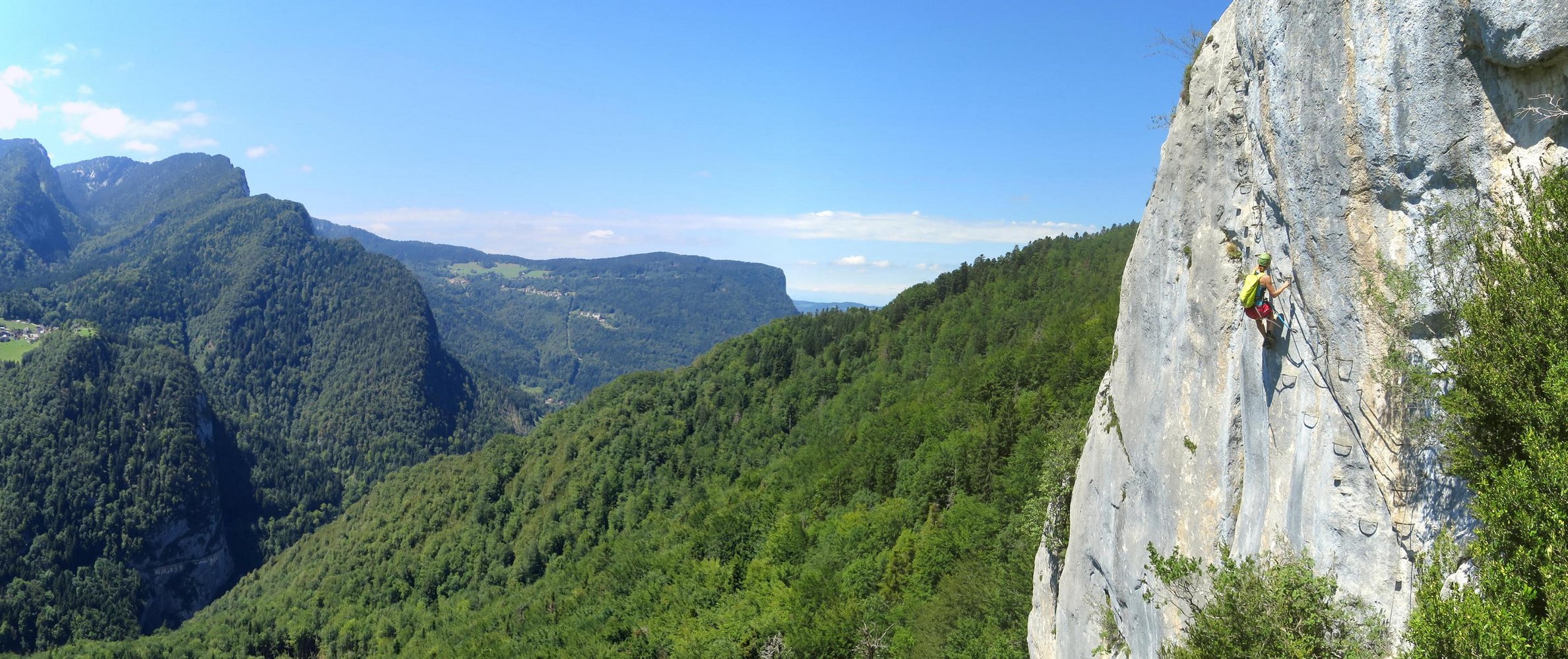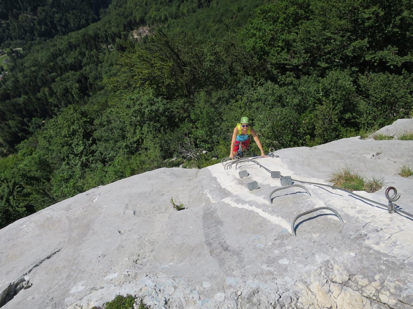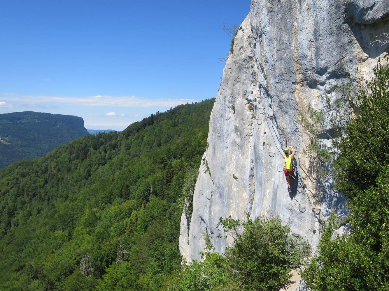Im Chartreuse Massiv zwischen Chambéry und Grenoble sind die Franzosen unter sich und genießen die auf der Hochebene in bewaldete Täler eingebetteten Berge, malerischen Ortschaften und den Kräuterlikör. Ein besonders schöner Ort ist Saint Pierre-d'Entremont mit seinen malerischen Häusern. Direkt über dem Ort ragt der Rocher Veyrand in den Himmel und durch seine Südwand führt der gleichnamige Klettersteig, der aus zwei Teilen besteht. Teil eins schlängelt sich gemäßigt (B/C) einen Grat entlang und endet bei der Hängebrücke. Teil 2 quert entlang kleiner Höhlen unter die Gipfelwand und sucht sich dort den steilsten Weg nach oben.