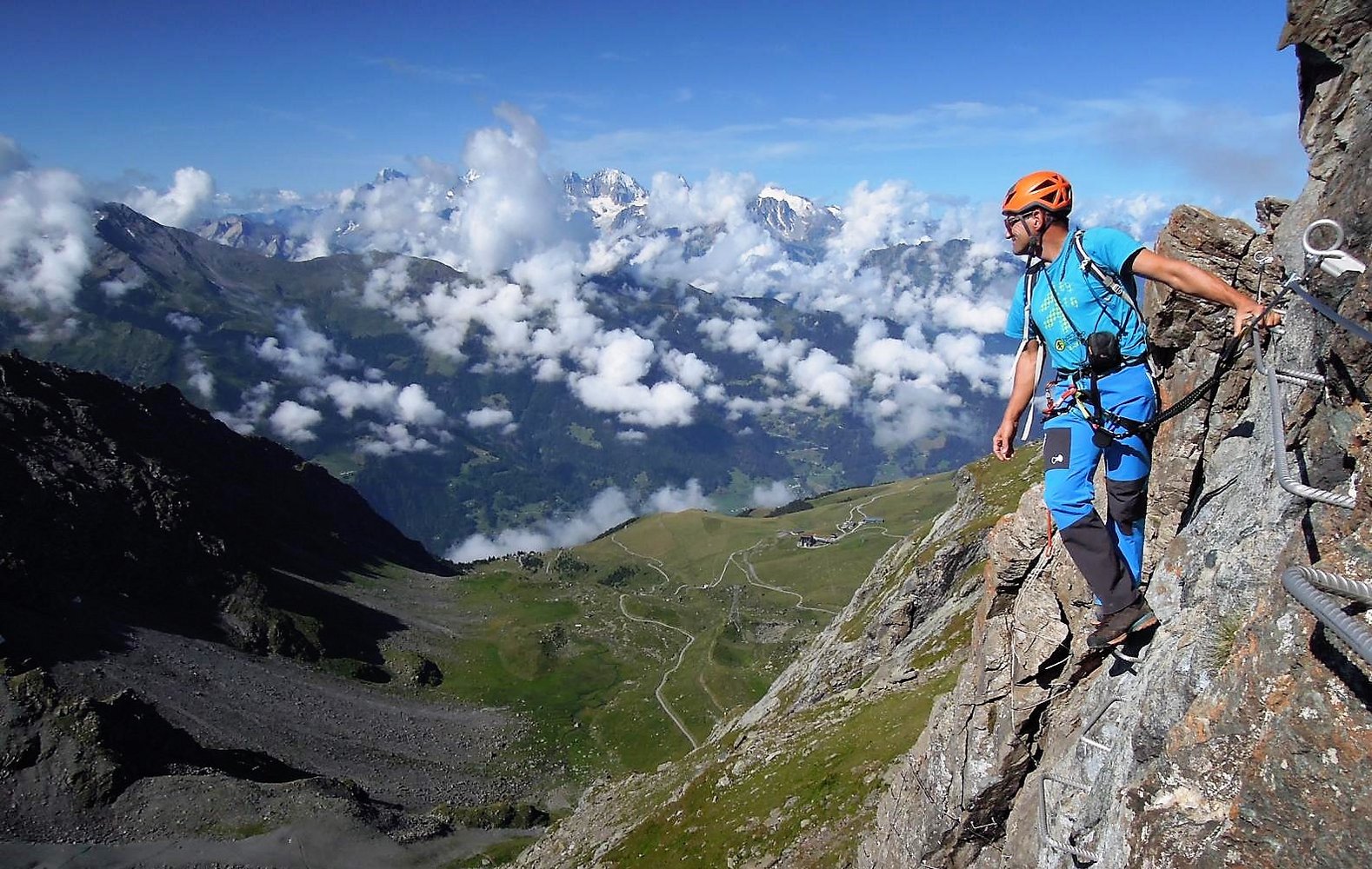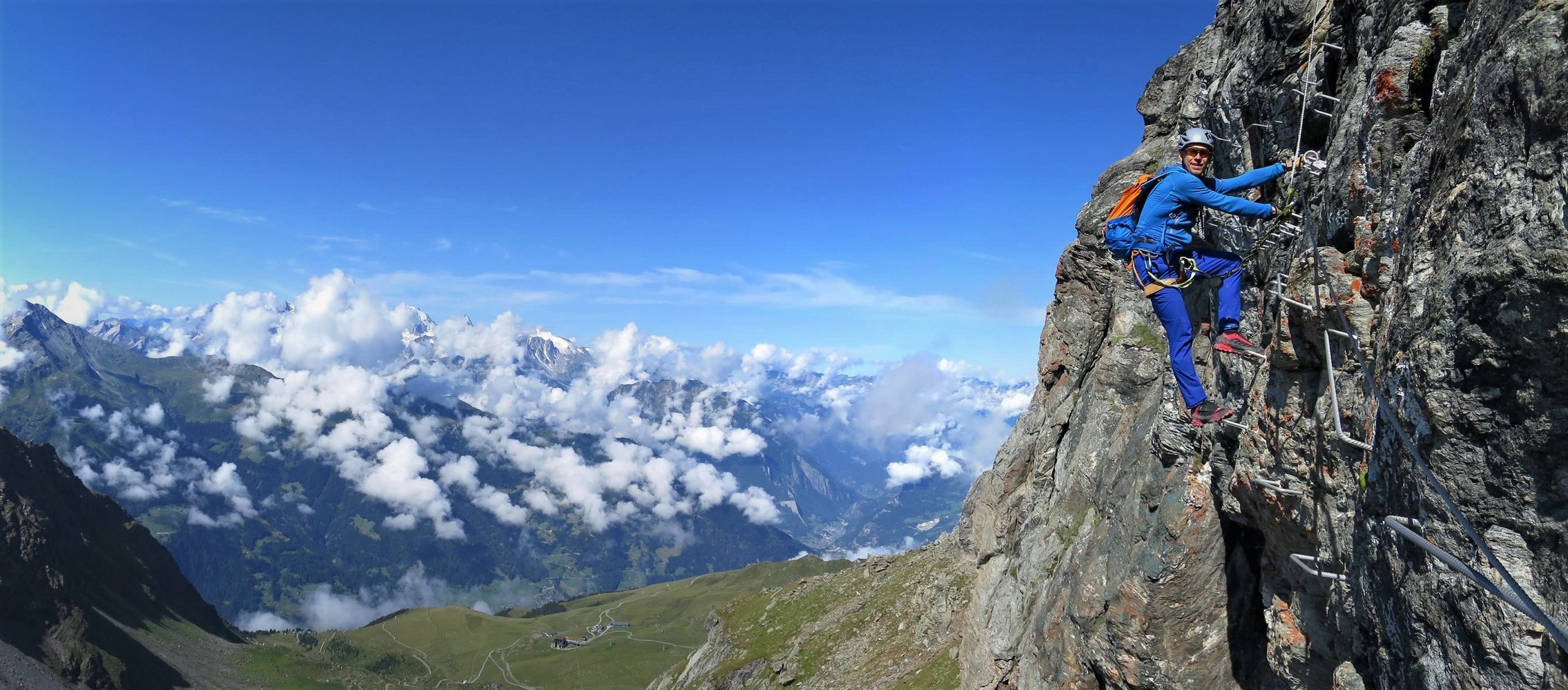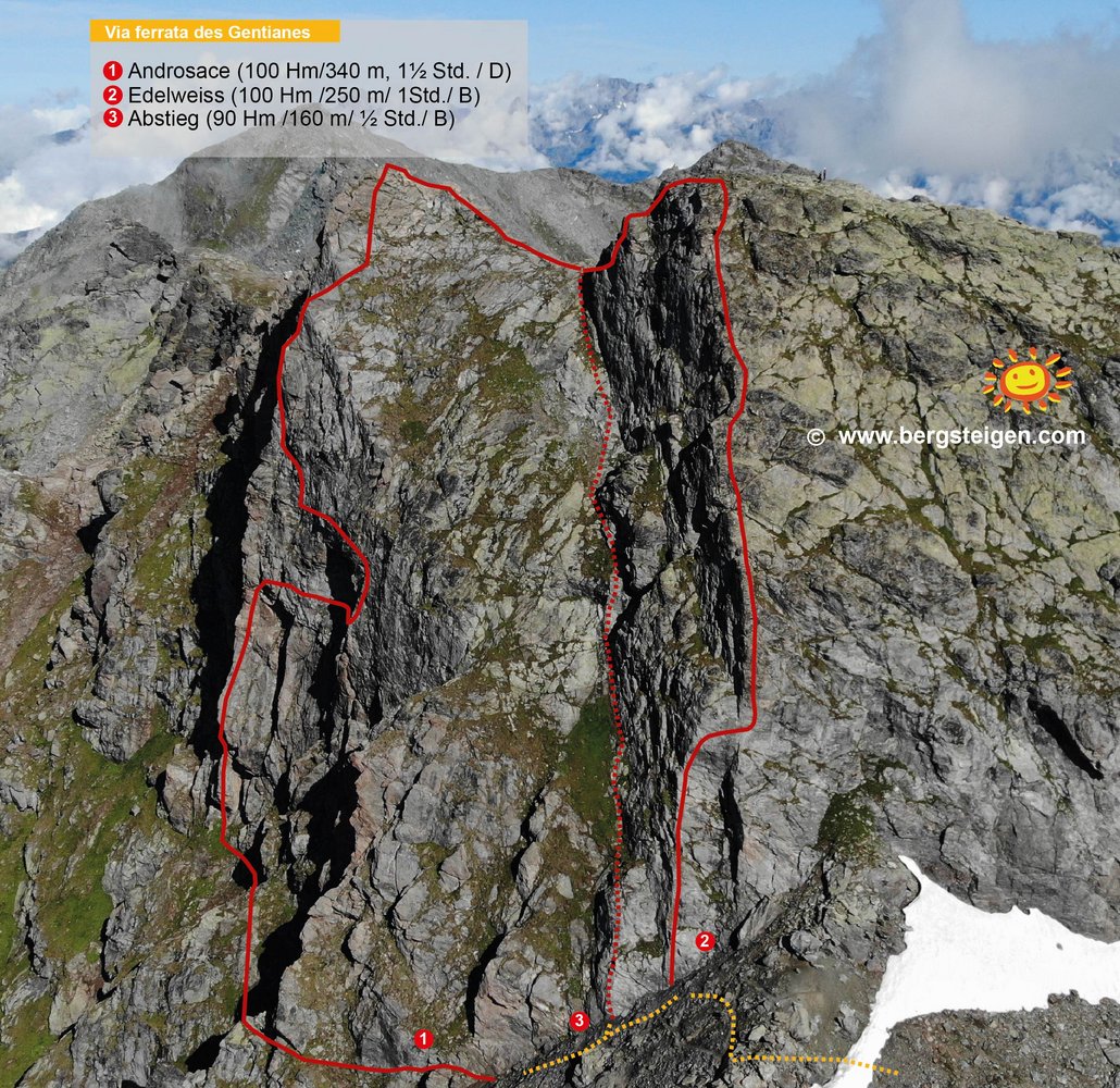 Der Steig selbst bietet auf seinen rund 340 Klettermetern sehr abwechslungsreiche Kletterrei und einen grandiosen Ausblick auf den Grand Combin und die Mont Blanc Gruppe.