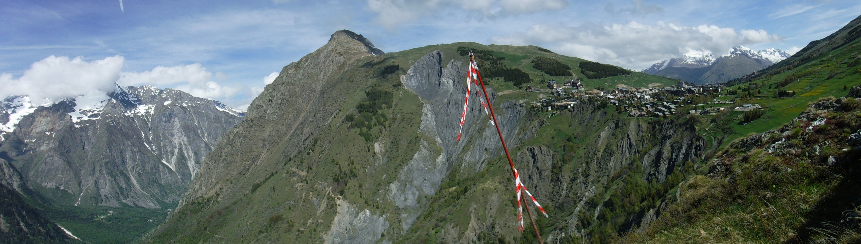 Von der Bergkuppe läuft man den Trampelpfad kurz ostwärts hinab zu nahem Gras-Sattel, dann linksdrehend in die Nordwestflanke des Bergs. Dabei gibt es 3 kurze seilgesicherte Stellen. Nach 12 min. trifft man auf den Wanderweg Nr. 630B beim Holzwegweiser. Nach rechts hinauf kommt man in 15 min. zum aussichtsreichen Gipfel des Perrons (1842 m), bzw. nach Le Diable, oder St-Christophe en Oisans. Für den direkten Abstieg hält man sich jedoch links und läuft nordwärts leicht links drehend zum südöstlichen Rand der Chalet-Siedlung von Les Deux-Alpes. Beim Wegweiser von Boulotière (1640 m) hält man sich links und läuft anschließend durch die Rue des Sequoias durch die Siedlung zur Bergstation der Luftseilbahn (LSB) mit den Gondeln für 6 Personen (25 min.) nach dem Wegweiser von Sainte Luce (1618 m). Links von der Bergstation der LSB beginnt der Lehrpfad Sentier de découverte de Venosc (Weg Nr. 503) im Abstieg.