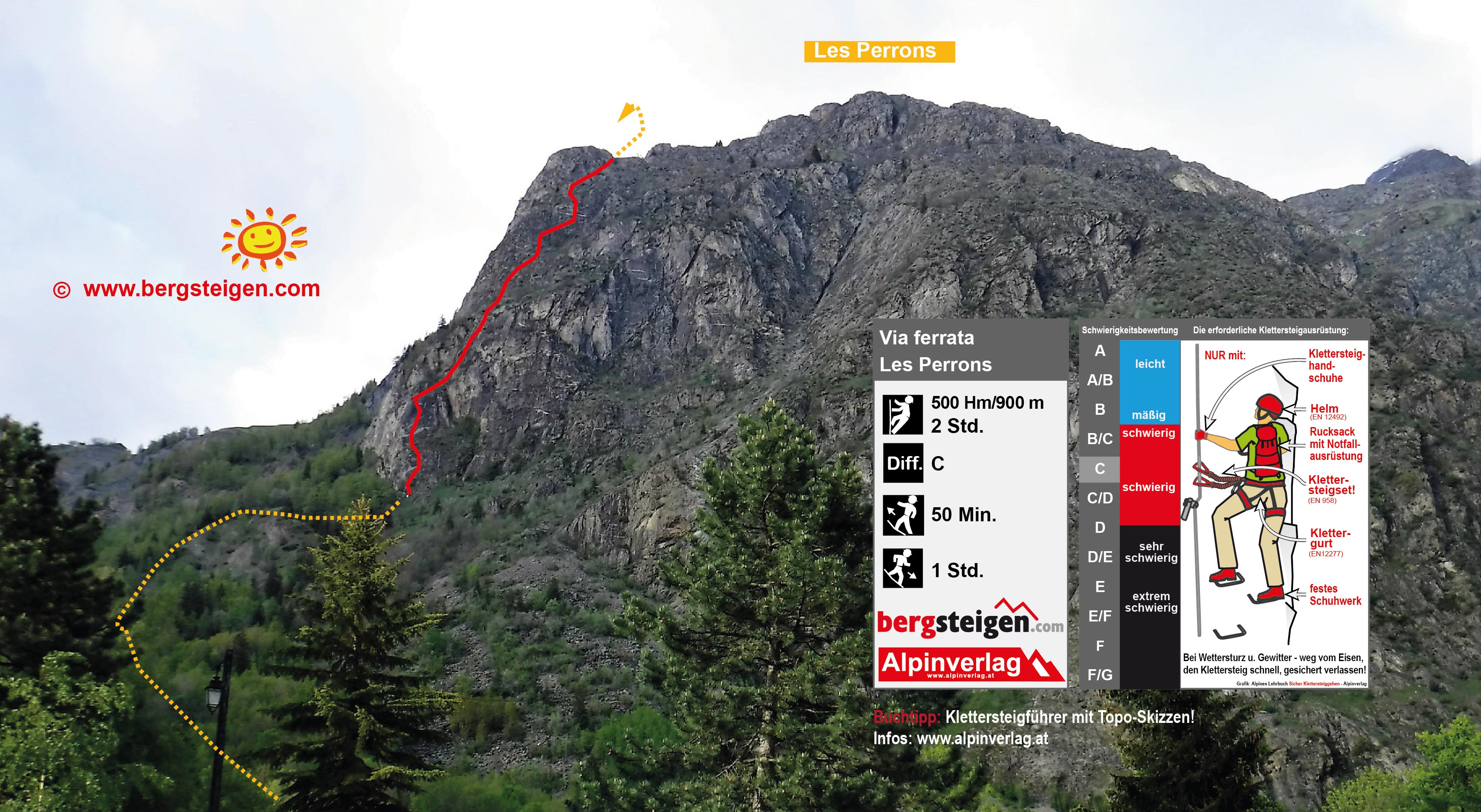 Der Beginn erfolgt schräg links auf Eisenbügeln links vom Seil eine erdreiche, flache Felsrinne hinauf zu einem begrünten Felsvorsprung. Weiter hinauf führt das Seil links von einer Verschneidung zu einem Felsdach (Schildchen:N 1390). Rechtsdavon wird eine Felsstufe senkrecht hoch überwunden zum Felsabsatz (L 1435). Danach wendet man sich nach links hinauf zu einer großen Felsschuppe, an der man rechts vorbei klettert (K 1470). Nächste Felsstufe führt zur Höhe Y 1515. Dann folgt eine luftige senkrechte Wand mit einer kleinen überhängenden Felsschuppe (H 1545). Anschließend wird nach rechts hinauf gequert (G 1564). Letztes Stück ist dann noch einmal steil hoch (F 1605). Dann erreicht man Gehgelände auf einer breiten Grasterrasse (E 1640). Ab hier sieht man links hinüber zum Wintersport-Retorten-Dorf Lex Deux-Alpes. Man geht nun den oberen Felskopf des Berges an (C 1675). Auf Eisenbügeln gelangt man zur Schlüsselstelle, einem Überhang (B 1700), den man aber mittels eiserner Griff- u. Tritthilfen überwindet zum Ausstieg (A 1750). Dort gelangt man auf breiten Grasbuckel, der das westliche untere Ende des Bergrückens vom Les Perrons darstellt vor dem Felsabbruch (1¾ Std.). Auf dem Grasplateau steht eine Stange mit Luftsack für die Gleitschirmflieger.