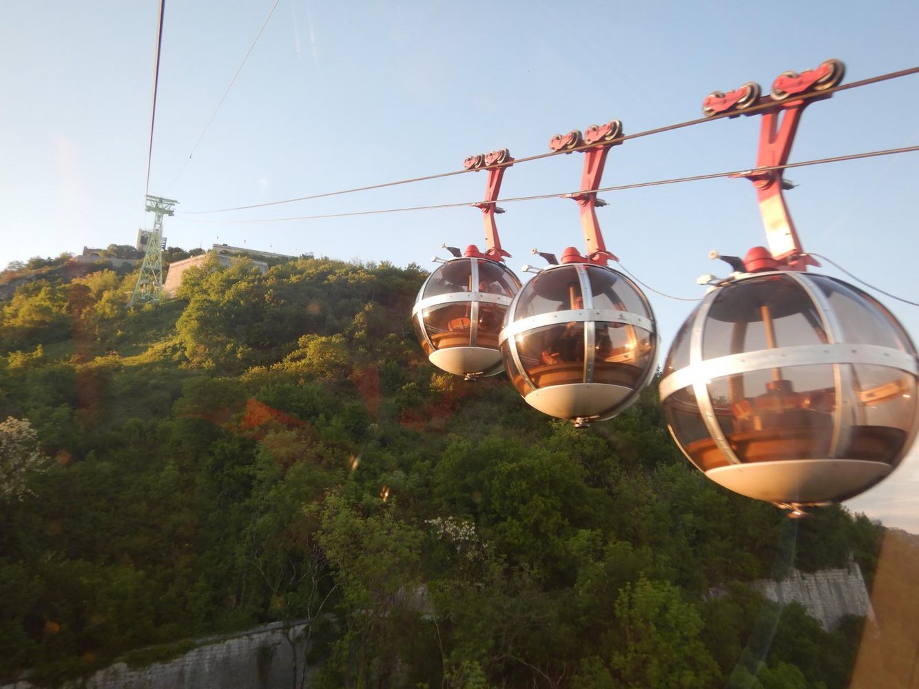 Treppen und Wanderweg durch den Jardin des Dauphins abwärts – oder etwas aufwärts über Treppen zum Wahrzeichen von Grenoble, der Luftseilbahn mit den Eiergondeln