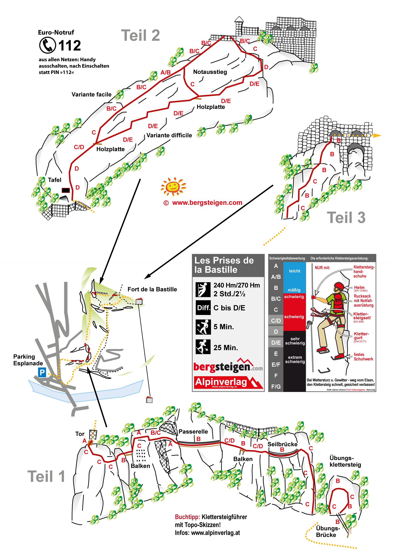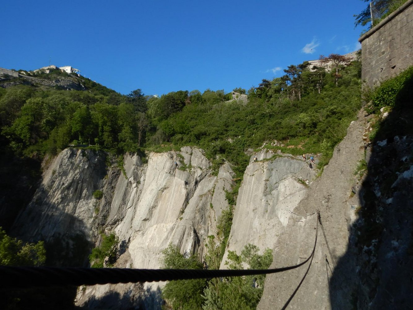 Der schöne Stadt-Klettersteig von Grenoble ist ein sehr beliebtes Ausflugsziel vorallem an den Wochenenden und hauptsächlich der leichtere 1.Teil ist sehr viel begangen. Der 2.Teil ist wesentlich anspruchsvoller und danach wandert man durch den Burggraben zum kurzen 3.Teil, der die Mauern der Stadtfestung überwindet