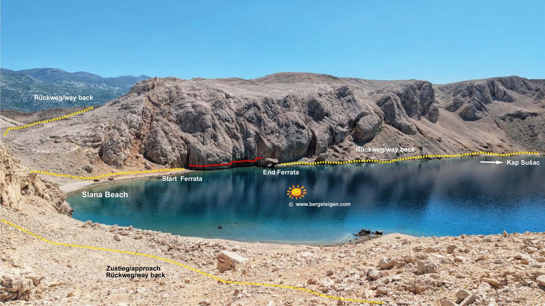 Der ca. 100 m lange Klettersteig verläuft entlang der Felsen über dem Meer und verbindet den Strand Slana und das Kap Sušac. Die Via Ferrata Life on Mars ist leider nur sehr kurz und bei Bedarf Teil des Life on Mars Trails. Wie der Name Life on Mars schon vermuten lässt, handelt es sich um eine unwirtliche und lebensarme Ecke. D. h., man sollte unbedingt ausreichend zu Trinken und zu Essen mitnehmen und Sonnenschutz, um sich zugleich vor der erbarmungslosen Sonne zu schützen, damit man nicht gegrillt wird.