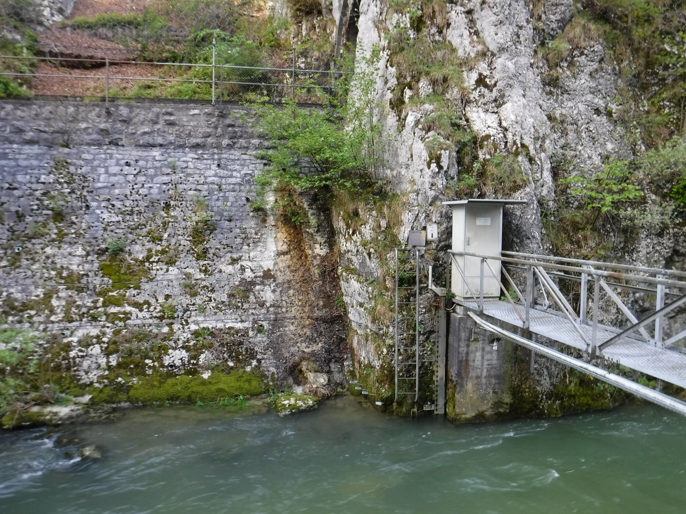 Am Kasten steigt man links über die Brüstung zur Leiter und auf dieser hinab bis knapp über den Fluß. Dann um die Felsecke auf löffelförmigen Trittblechen rechtsherum auf zum gemauerten, ca. 50° schrägen Bahndamm. Diesem folgt man in nördliche Richtung auf langen U-förmigen Eisenbügeln über dem Wasser. Als „Handlauf“ dient das an Fels und Bahndamm fixierte Sicherungsseil. Auf aus Bandstahl gebogenen Trittbügeln steigt man hinab auf einen schmalen Weg am rechten Flußufer. Auf diesem zu einer beginnenden Bandstahl-Bügelreihe nach oben zum Maschendrahtzaun auf Gleishöhe. Dabei schreitet man über einen aus 3 Eisenstangen bestehenden Metallsteg über eine schmale, wasserführende Blechrinne. 3 Holzbretter bilden den nächsten Steg an einer abschüssigen erdigen Stelle. Ein weiterer zu einer Felskante. Diese wird luftig direkt über dem Wasser hinab umrundet. Anschließend führt das Sicherungsseil unterhalb des abgezäunten Bahngleises hinab zu den nächsten Trittbügeln an zweiter Felsnase über dem Wasser. Auch diese wird luftig umrundet zu einem kurzen Sandwegstück. Das Seil endet am 2. Eisenbahntunnel, der nur 10,7 m lang ist. Hier endet auch der kurze Klettersteig (15 min.). Und hier beginnt die erste Seillänge (4 b) durch einen treppenförmigen Kamin im Kalksteinfels, in der 3 Bohrhaken stecken. Hat man ein 60 m Seil dabei, erreicht man nach 5 Seillängen den Ausstieg der populären Kletterroute vom Arête Spéciale über einen Felsgrat nach 140 Hm (2 Std.). Entlang des Maschendrahtzaunes kommt man bis zur Lücke vor dem 3. kurzen Eisenbahntunnel. Auf gegenüberliegender Seite sieht man ein Elektrokabel und ein 10 mm Stahlseil in einem bewaldeten Kanal hochführen zu einer gemauerten Stützbrücke. Unterhalb eines Steinfallgitters endet das Seil. Dieses dient lediglich den Inspektionsaufgaben.