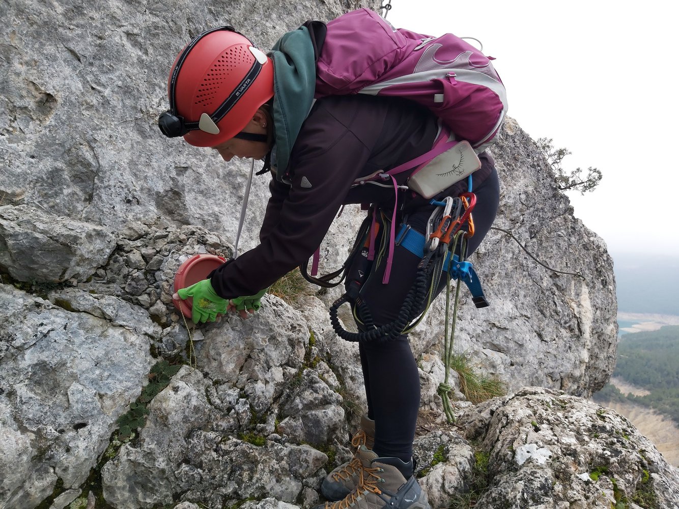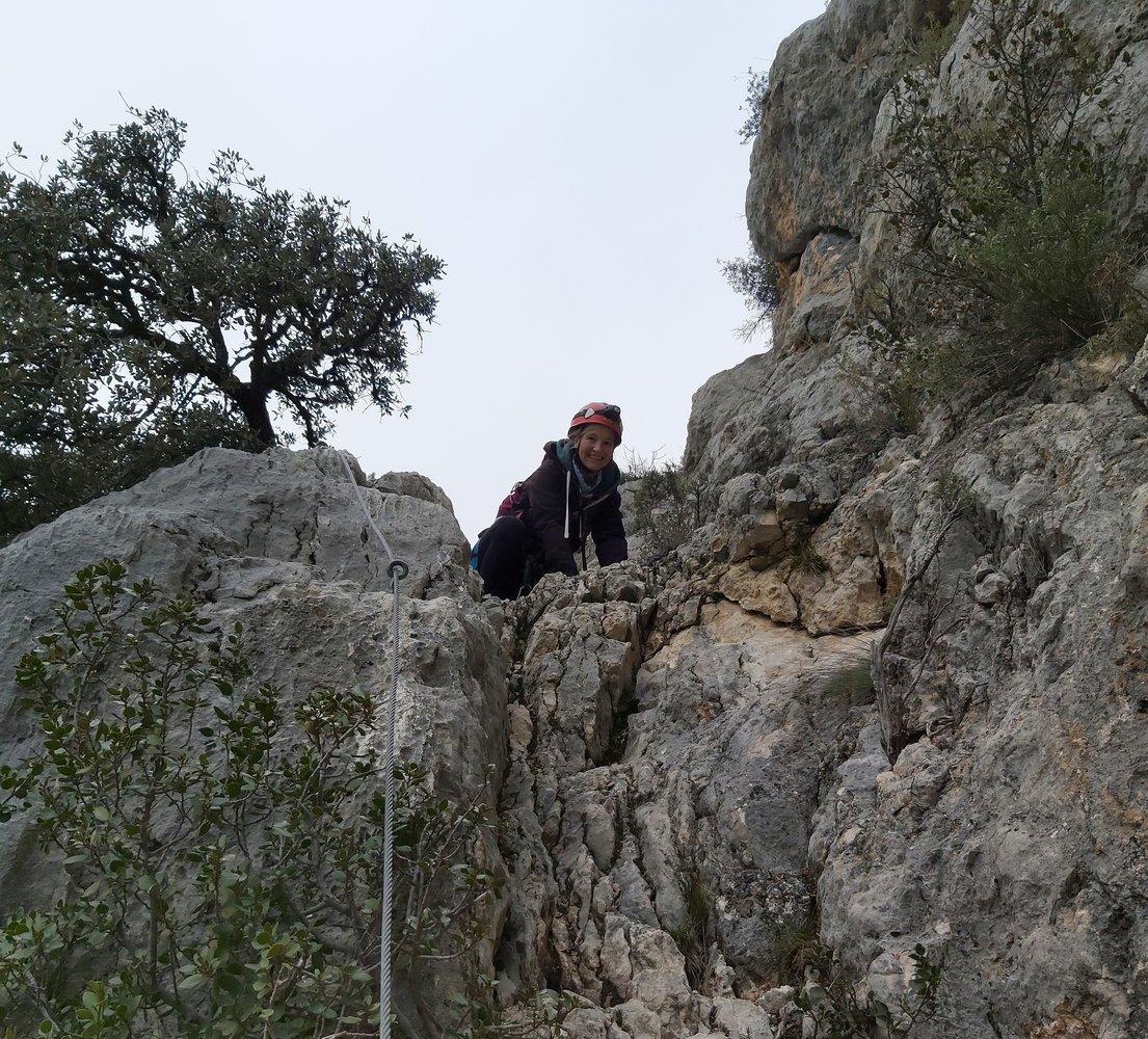 Vom Parkplatz folgen wir dem breiten Weg nach Norden, um am Schild zur Mare de Déu de la Pertusa nach links abzubiegen. Wir halten uns von Anfang an südseitig des Grates und folgen dem Trampelpfad hinunter Richtung See. Wir müssen aufmerksam sein, um den Zustieg nach rechts nicht zu verpassen. An einem gekennzeichneten Felsdurchschlupf sind wir bereits zu weit gelaufen und können kurz später alternativ über den Via Ferrata Los Teletubbies in den VF Olmo Soler einsteigen (Empfehlung).