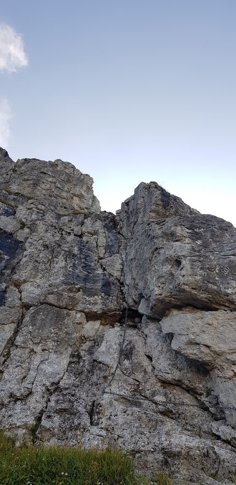 Gleich Anfangs geht es steil über die Einstiegswand die in weiterer Folge um eine Ecke in eine Scharte führt.Hier wartet die erste schwerere Verschneidung auf den Begeher. Weiter über eine Wand mit Bügeln. Über einen grasigen Rücken steht man nun vor der Auswahl ob man links die Variante "difficile" oder rechts die leichtere Variante "facile" wählt.