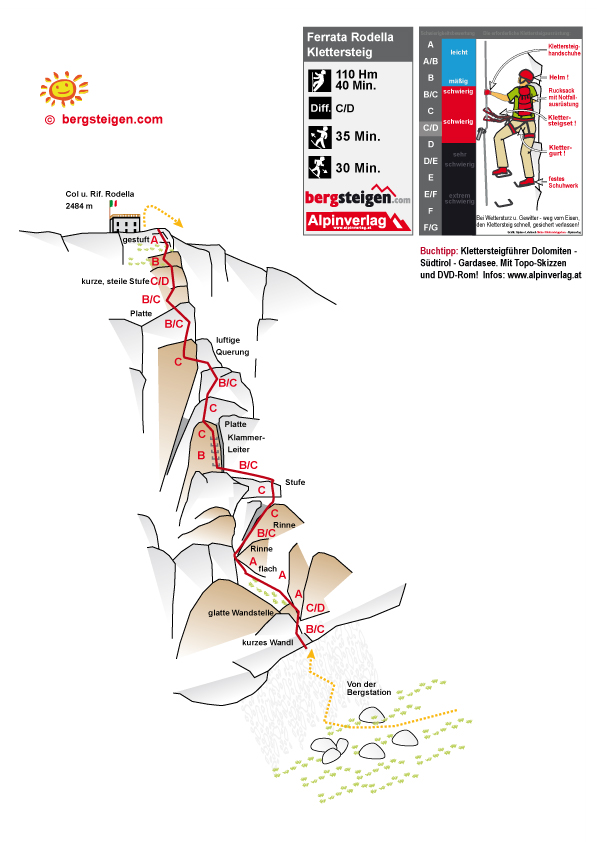 Nach der kurzen Einstiegswand (B/C und C/D) erreicht man ein grasiges Flachstück (A). Am Ende davon rechts in einer Rinne (C) aufwärts, an deren Ende folgt ein kurzes Steilstück (C). Danach wieder links (B und B/C) zu einer Klammerleiter (B und C), an deren Ende eine glattere Wandplattenstelle kommt (C). Nun weiter im Zickzack hinauf (B/C) bis man zu einer luftigen Plattenquerung (C) kommt. Danach über eine kurze, steile Stufe (C/D) zum Nahbereich einer Kante. Im Zickzack hinauf (B) bis das Gelände flacher wird (A) und man direkt beim Rif. Rodella zum Ende der Seilsicherung kommt.