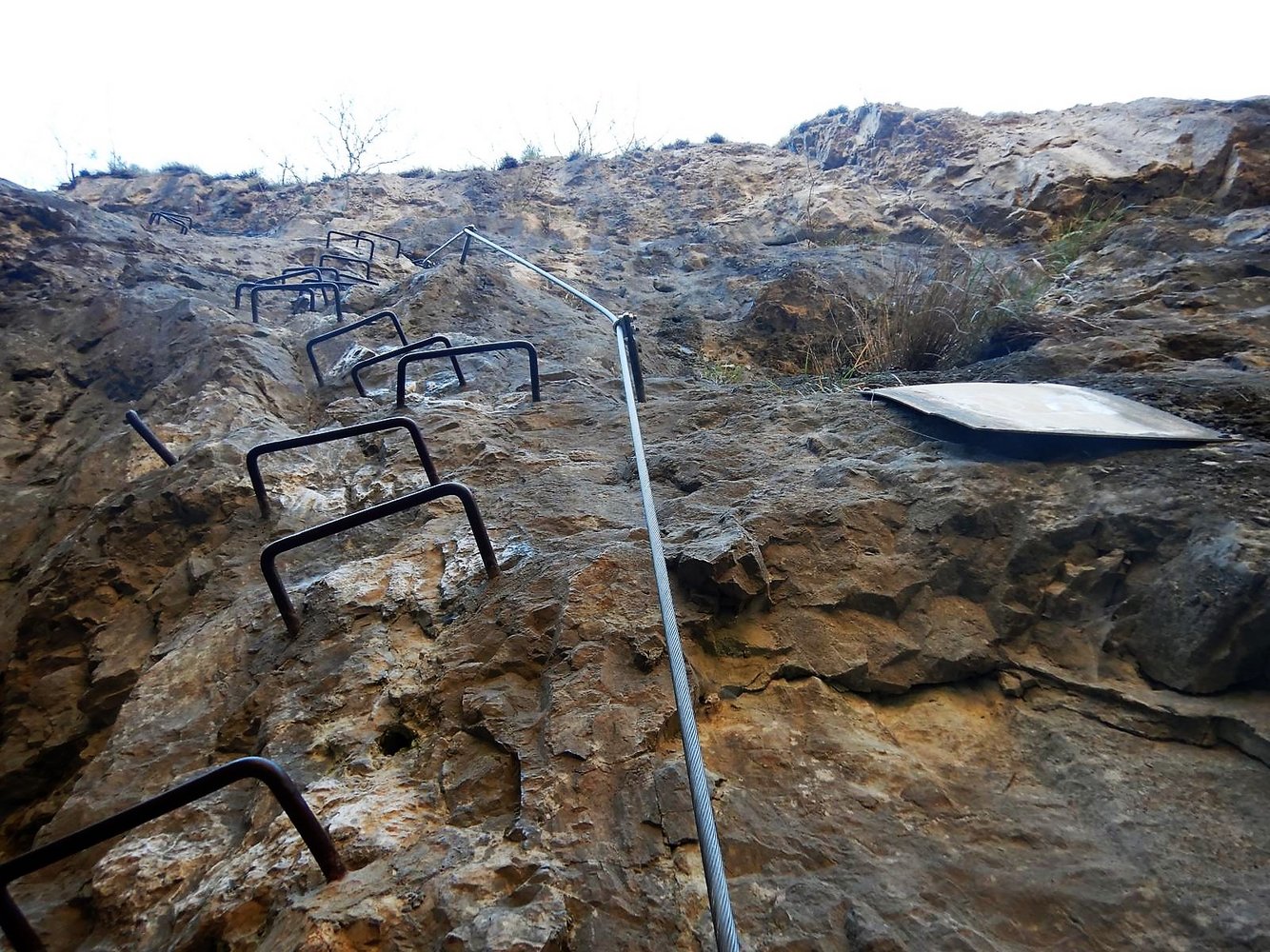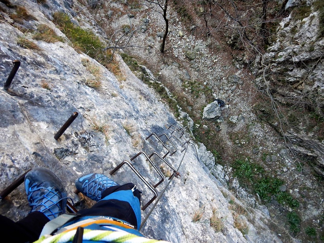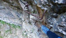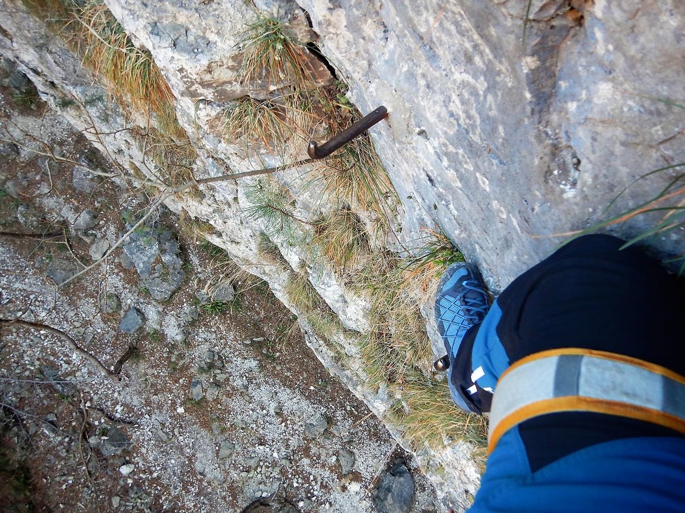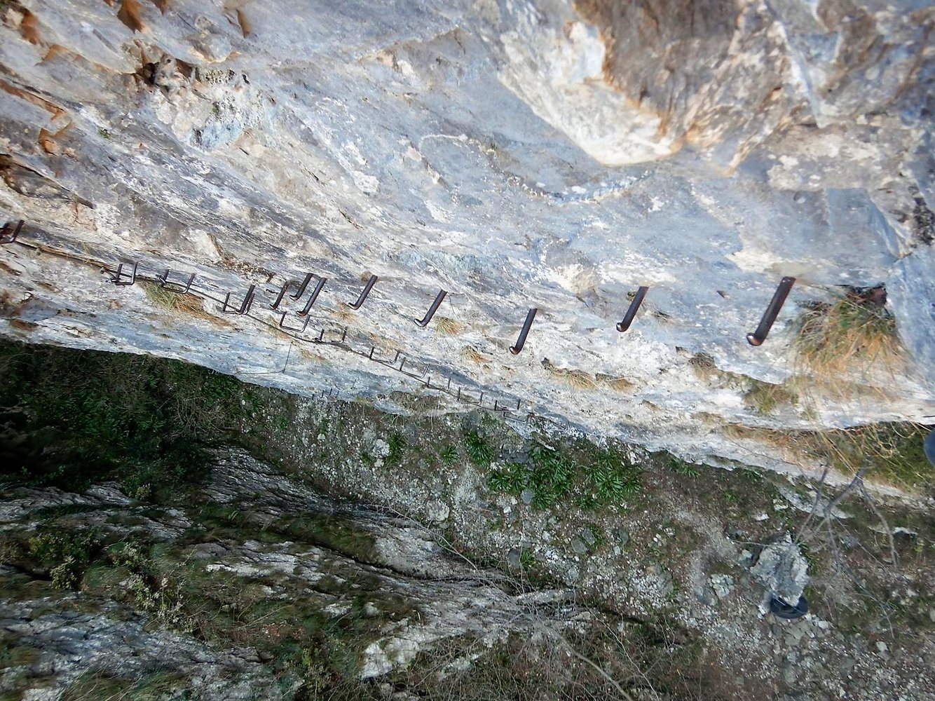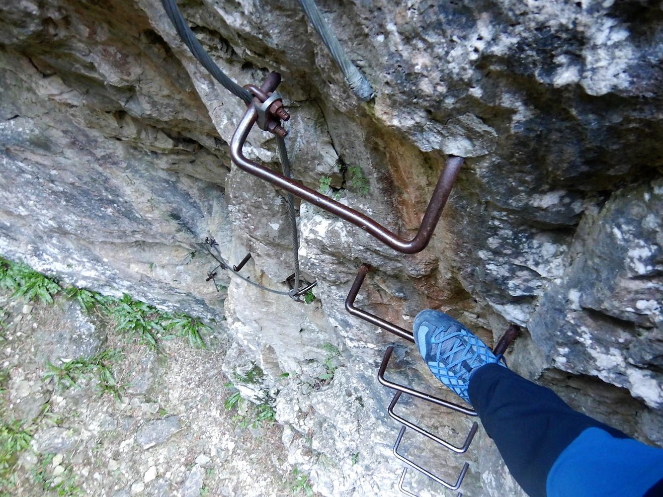 Es folgt eine Klammernreihe abwärts in die 3.Stiftquerung. Eine letzte Klammernreihe leitet hinunter Richtung Boden in dem kleinen Taleinschnitt. Ein kurzes Stück ist mit den Füßen am Fels zu steigen. Dann endet das Stahlseil – und der KS muss in 1+ ohne Sicherung zu Ende geklettert werden.