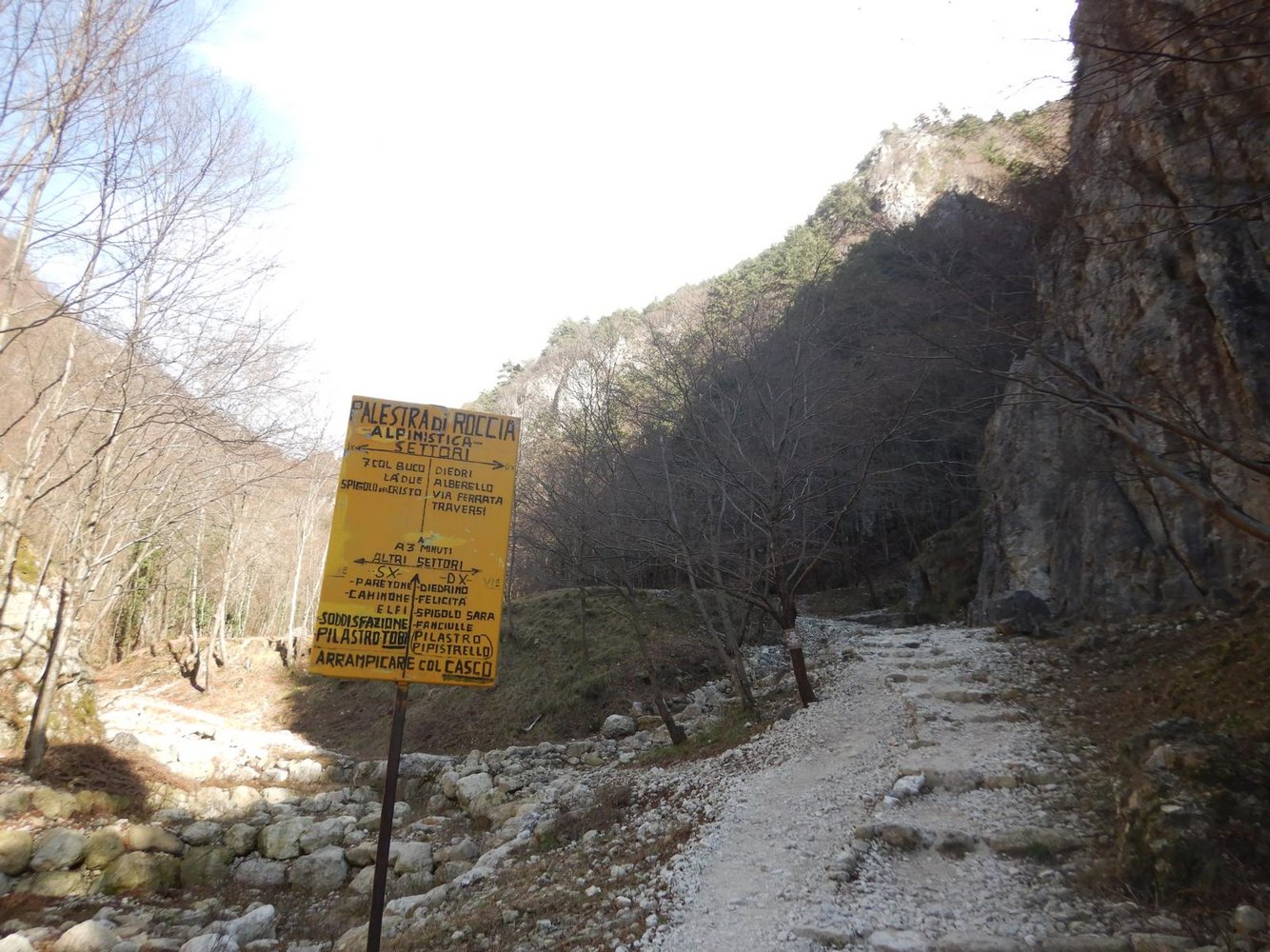 Vom Parkplatz nach Norden an der weithin sichtbaren Kapelle vorbei am Hauptwanderweg sanft ansteigend ca. 100 Höhenmeter talaufwärts, parallel verlaufen in der trockenen Jahreszeit Pfade im Bachbett. An mehreren Abzweigungen für Felsklettersektoren vorbei bis zur Tafel `Palestra di Roccia alpinistica` direkt am Hauptweg. Einstieg gleich danach rechts am Fels.