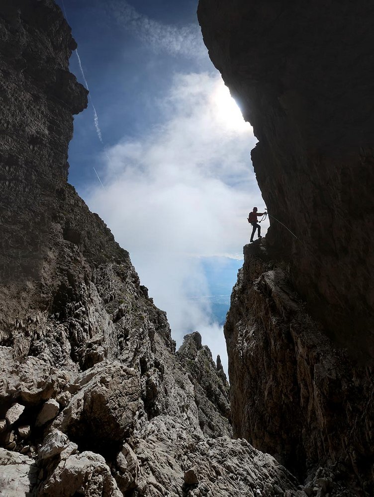 Von den Schiara-Klettersteigen gehört die Ferrata Sperti sicher zu den wildesten, steigt man doch oben direkt durch eine große Schlucht auf den Schiara- Kamm. Gerade dieser Umstand macht den Steig zum attraktiven Ziel. Man ist meist mit wenigen Gleichgesinnten unterwegs. Hat man den Kamm erreicht und die zahlreichen kleinen Stufen an der Rückseite gemeistert, steht man direkt beim Felsenfi nger „Gusela del Vescova“ - einem der Schiara-Wahrzeichen. Je nach Ausdauer und Kondition steigt man danach entweder über die Ferrata Zacchi ab oder hängt die Ferrata Berti zum Hauptgipfel der Schiara an.