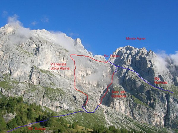 Wegen der vielen nicht versicherten Passagen ist die Via ferrata Stella Alpina ein eindrucksvolles, aber auch sehr alpines Klettersteigabenteuer und gehört mit Abstand zu den anspruchsvollsten Eisenwegen in der Palagruppe. Nach einem luftigen Vertikal-Stück mit einigen knackigen Steigpassagen zu Beginn quert man sehr lange über die sog. Edelweißwiese - die auch mit etlichen leichten Kletterstellen gespickt ist - hinüber zur Forc. Pizon und zum Biasin Biwak. Vom Biwak in nördliche Richtung zum fast 3000-Meter hohen Gipfel des Monte Agnér, auf dem man einen imposanten Rundblick genießen kann. Auch der lange Abstieg hat es in sich - man kann zwischen der riesigen Südschlucht (erhöhte Steinschlaggefahr) oder dem besseren, aber etwas längeren „Weg der Erstbesteiger“ wählen.