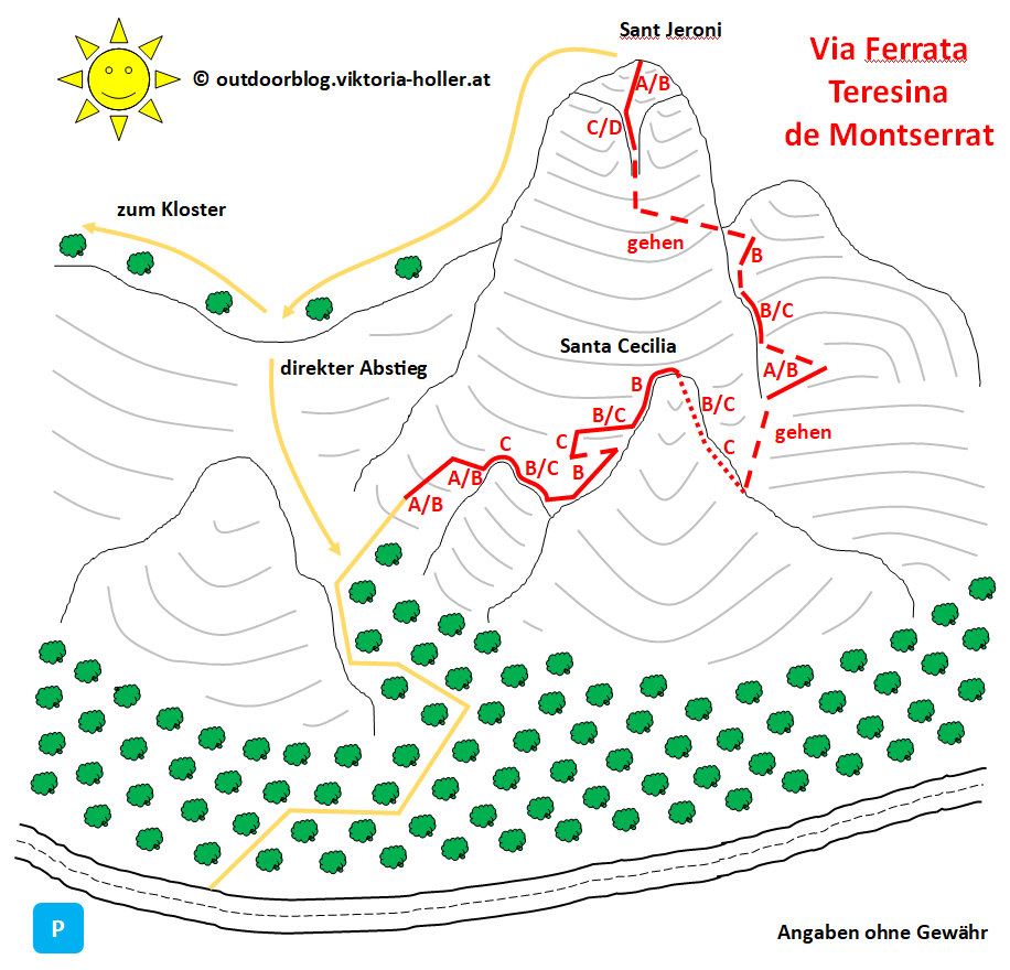 Wir jedoch haben den Klettersteig mit einer Rundwanderung zum Kloster Montserrat kombiniert. Mehr Infos dazu findet ihr auf meinem Blog unter: Gipfelstürmen rundum Barcelona – Via Ferrata Teresina mit Rundwanderung zum Kloster Montserrat.