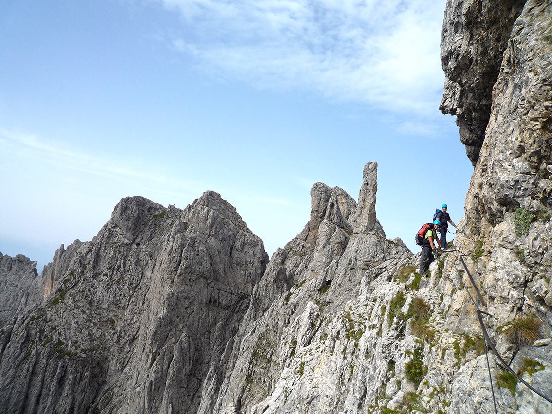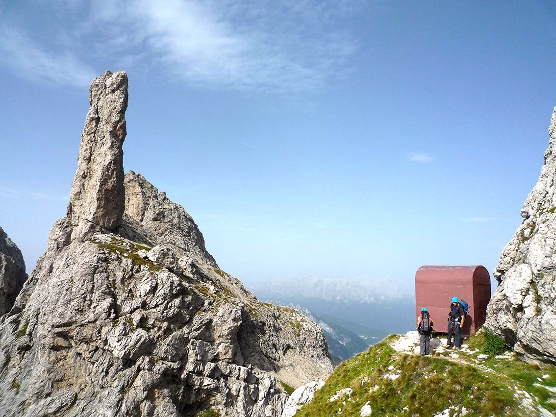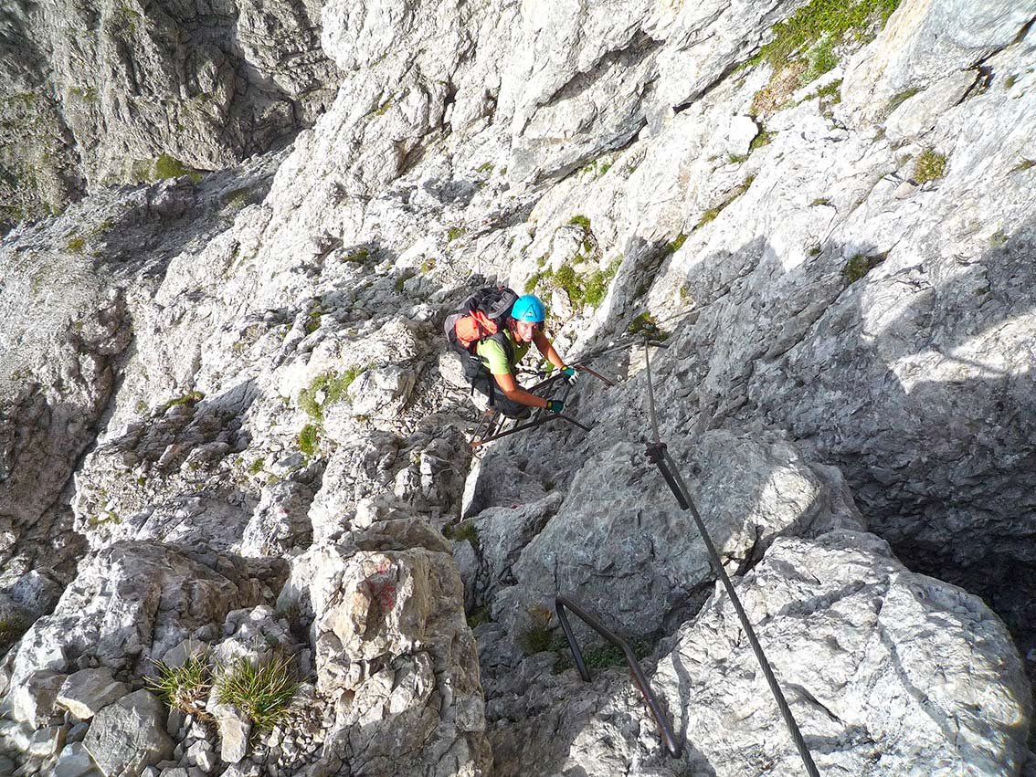 Via ferrata Zacchi (C, 620 Hm, schwierig): Nach rechts in den Kamin, zwei Leitern hinauf (B) und über ein schmales, überdachtes Band nach links zu einem Rinnensystem, davor ist die Abzweigung der Ferrata Màrmol. Durch die Rinnen (B/C) mit Leitern auf einen Latschenabsatz. Dann nach links zum gestuften Beginn eines rampenartigen Grates. Nach einer mit Klammern versehenen Felsstufe (A/B) kommt man zur Schlüsselstelle - einer mit Seil versehenen steilen Rinne (C). Danach aufwärts (A, dann A/B) mit kurzer Leiter (B), bis man auf einen markanten Grat mit Steinmann kommt. Dem immer steiler werdenden Grat anfangs zu Fuß, dann versichert (A) zu einer Rampe (bis B) folgen, die zum Abschlusspfeiler führt. Unmittelbar davor noch eine exponierte Ecke (B/C). Auf Leitern (B/C), dann leichter zum Ende des Pfeilers. Eine letzte exponierte, versicherte Stelle (A) führt zum Biv. della Bernardina, 2320 m. Kurz davor zweigt rechts die Ferrata Berti ab.
