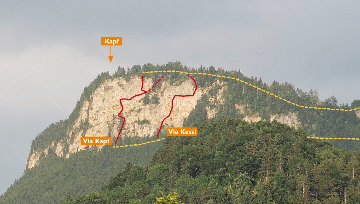Die Tour läst sich sehr gut mit der Via Kapf kombinieren - oft wird die Via Kessi abgeklettert (geht besser zum Abklettern) und dann wieder über die Via Kapf aufgestiegen (siehe Topo).
