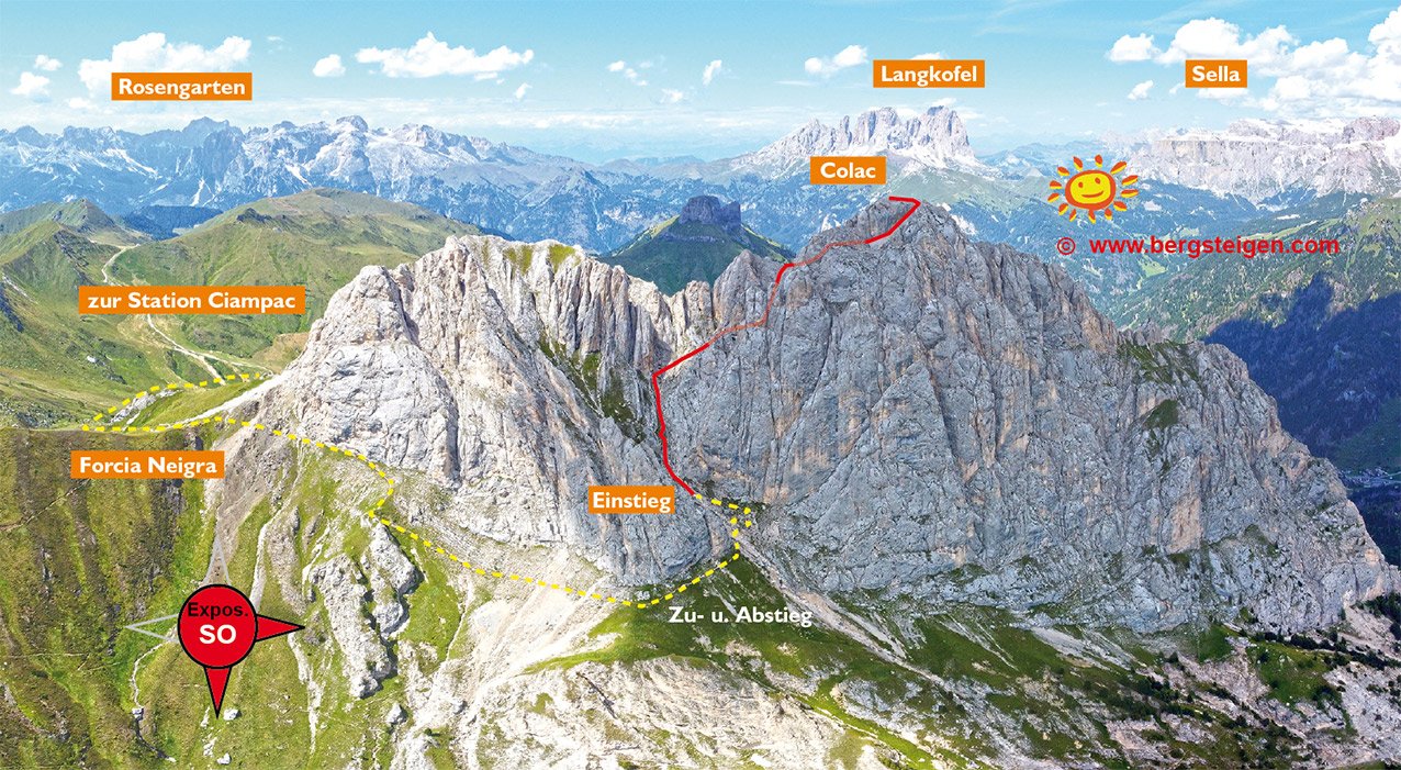 Siehe Topo. Von der Tafel an der Ecke geht man zum Einstieg (kurz B) bei der großen Rinne. Am linken Rinnenrand aufwärts (A/B), dann oben die Rinne queren (A/B) und im steilen Schutt (A) zu einer Scharte. Weiter auf dem Schuttpfad zu den Versicherungen (A) in einem sehr großen Schuttkar. Dem Seil entlang aufwärts, bei einem Spalt kurz steil (B, Klammern), dann wieder einfacher (A). Man quert auf einem Schuttpfad rechts zu einer steilen Stufe (A/B) und gelangt durch eine Spalt (A/B) zu den Gipfelfelsen. Im Schutt aufwärts auf den Gipfelgrat und zum 2715 m hohen Gipfel des Colac.