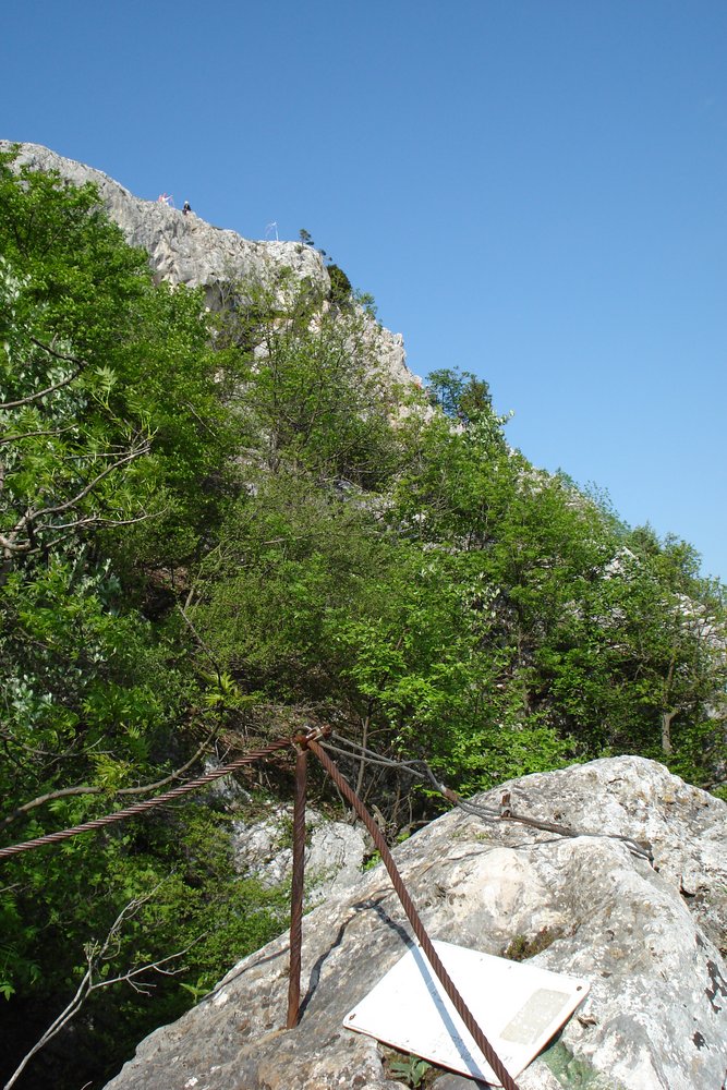 Am Schranken vorbei und am linken Rand der Wiese dem Steig zu Schutthalden folgen (rechts halten). Am Wandfuß dreht der Steig nun nach links und dann aufwärts der grünen Markierung am Felsen folgen. Rechts am Wandfuß geht es zu Kletterrouten und zum ÖTK-Klettersteig).