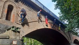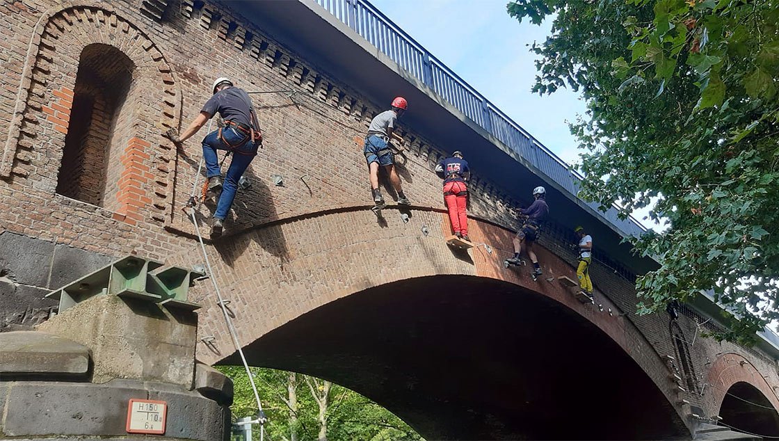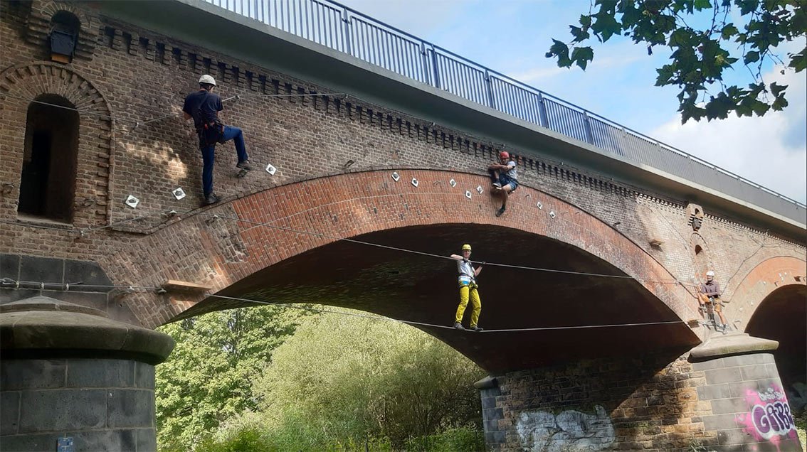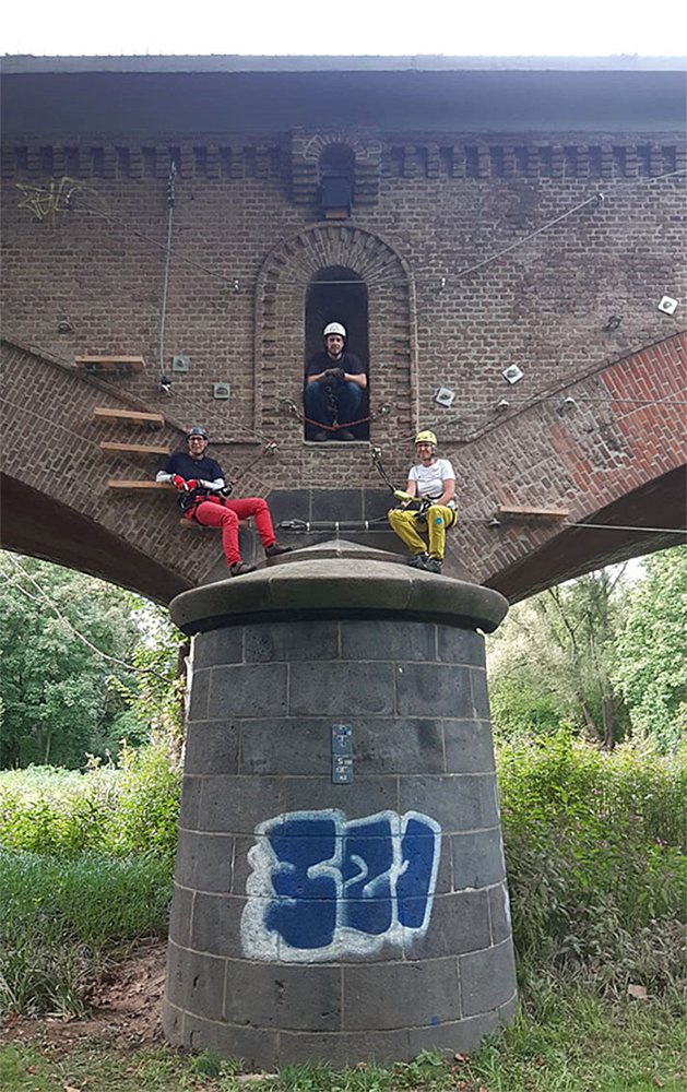 Der Klettersteig an der Vorlandbrücke mitten in Mülheim ist ein Projekt der DAV-Sektion Mülheim, welches gemeinsam mit dem Mülheimer Sportservice realisiert wurde. Es wurden ca. 170 Meter Seil an der Vorderlandbrücke verbaut, und Tritte und Podeste angebracht, sogar eine Zweiseilbrücke wurde installiert. Wer in Mülheim in unmittelbarer Nähe der Innenstadt direkt an der Ruhr einen Klettersteig versuchen will, ist beim Klettersteig an der Vorlandbrücke genau richtig.