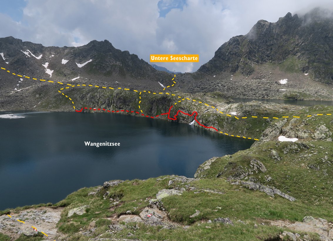 Vom Parkplatz Seichenbrunn über das Gaimberger Feld in die Untere Seescharte (2529 m) aufsteigen. Im Auf und Ab zur bereits sichtbaren Wangenitzseehütte und von der Hütte zum Seeufer absteigen. Am Ufer den Steigspuren und einzelnen Markierungen folgend (Stellen A) gegen den Uhrzeigersinn zum Beginn des Klettersteigs.