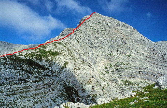 Die eher sparsam, aber ausreichend angebrachten Drahtseile, Trittstifte und Klammern führen mal direkt auf dem Grat, mal links davon hinauf zum rot-weiß-roten Gipfelkreuz.