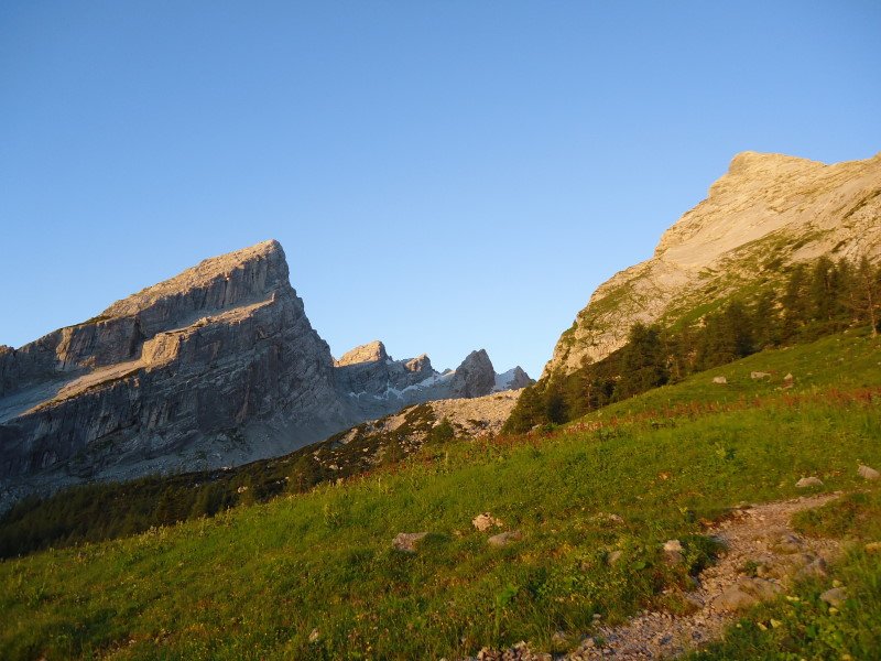 Abstieg (markiert, ganz leichte Kletterstellen bzw. tlw. versichert A kurz A/B): Von der Südspitze zuerst auf dem Grat in eine Scharte, dann durch eine Art Schlucht auf ein Schuttfeld. Danach weiter über eine neuerliche Steilstufe auf ein Wiesenstück, nach diesem folgt eine ungute Sandrinne. Vor der letzten Steilstufe gibt es eine längere Querung, kurz auch ansteigend, danach erneut eine Rinne (Kette) in einem Latschenfeld. Querend und absteigend erreicht man schlussendlich das große Schuttfeld (Ende der Schwierigkeiten). Dort beginnt der sehr lange Rückweg durch das Wimbachtal. Vorbei an der Wimbachgrieshütte (1326 m) und dem Wimbachschloß (937 m) erreicht man schlussendlich den Ausgangspunkt bei der Wimbachbrücke (634 m).