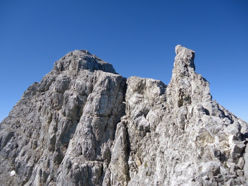 Mittelspitze (2713 m) - Südspitze (2712 m): Vom Gipfel der Mittelspitze zuerst kurz westlich, dann gleich wieder südöstlich am luftigen Grat abklettern (A und kurz sehr ausgesetzt ! ohne Sicherungsseil), bis man westlich nach Rinnne (A, enge Rinne B) wieder flacheres Gelände erreicht. Meist im Bereich des Grates oder westlich davon weiter, bis man erneut im Zickzak (A und ein ausgesetztes ungesichertes Band) absteigt. Danach weiter hinunter (A und Schrofenklettern 1-) bis man in eine Scharte vor einem zackigen, gelben Aufschwung gelangt. Die gelben Gratzacken werden westlich umgangen und man erreicht auf Bändern aufsteigend erneut den Grat (zuletzt A/B). Nach dem Band bei einem Block (A) weiter auf dem Grat (kurz A), dann wieder absteigen (A/B) und länger ungesichert (Steigspuren, westl. vom Hauptgrat) abwärts. Der Felsturm mit dem Sender wird im Schutt westlich zu Fuß umgangen. Auf einer Rampe hinauf zum Grat (ganz oben A). Im Bereich des Grates (A) bzw. östlich davon zum Gipfelblock (A). Der Gipfelblock wird westseitig (kurz A/B) erstiegen und man steht auf der Südspitze (2712 m).