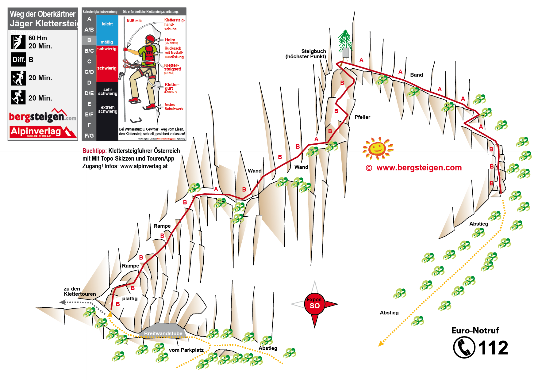 Siehe Topo. Die Tour beginnt links von der Breitwandstube. Anfangs auf einem flachen Grat (B), dann wird eine steile Wand gequert und am Ende an einem Pfeiler (B) zum Steigbuch. Ab dort auf dem Abstiegsband (A) zum Ende des Klettersteiges. Alternativ kann man auch den Zustieg zum Sektor B nehmen, am Wandfuß dann nach links zur Breitwandstube und dort weiter links zum Einstieg.