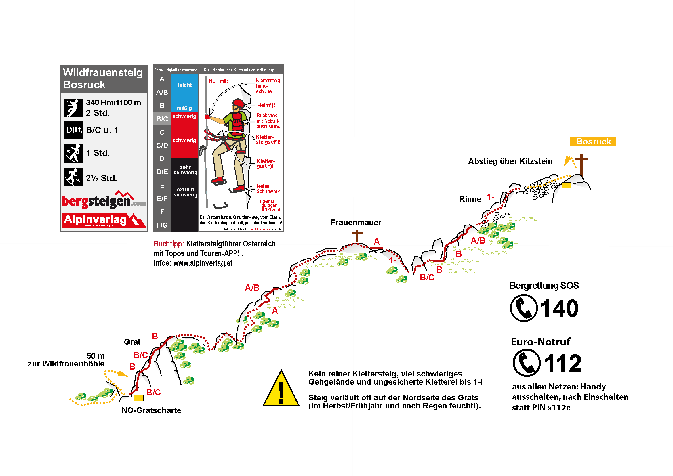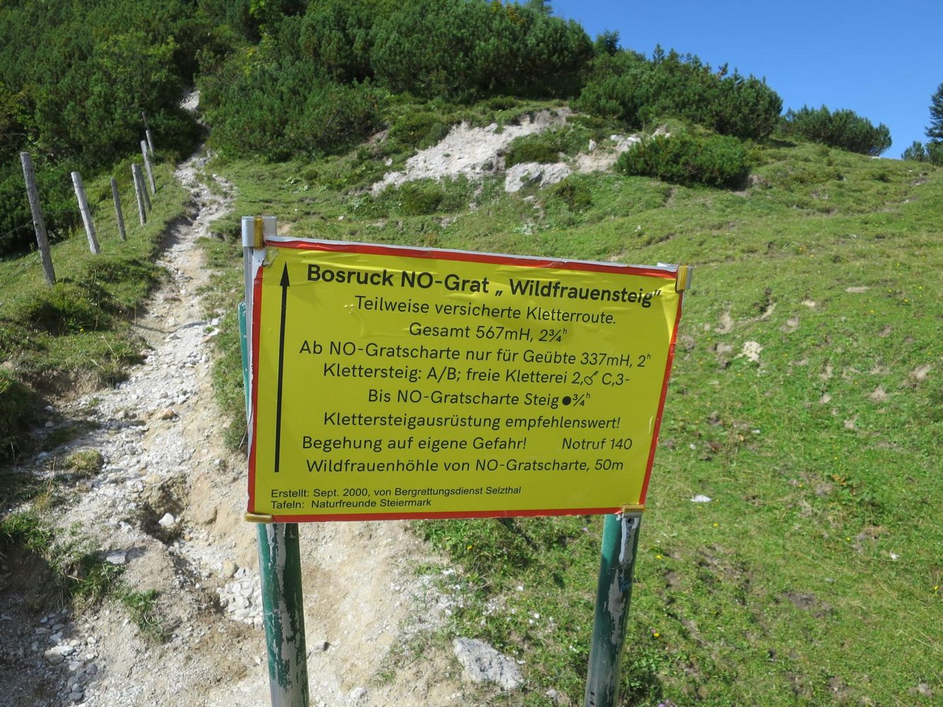 Bei Nässe ist der Steig äußerst unangenehm. Es gibt zahlreiche ungesicherte, ausgesetzte Passagen im Routenverlauf (Trittsicherheit unbedingt nötig)! Sage Wildfrauenhöhle: Es wird von drei „Wildfrauen“ berichtet, die von der Höhle aus, hoch oben auf dem Nordostgrat wohltätig Menschen und Tiere beschützen.