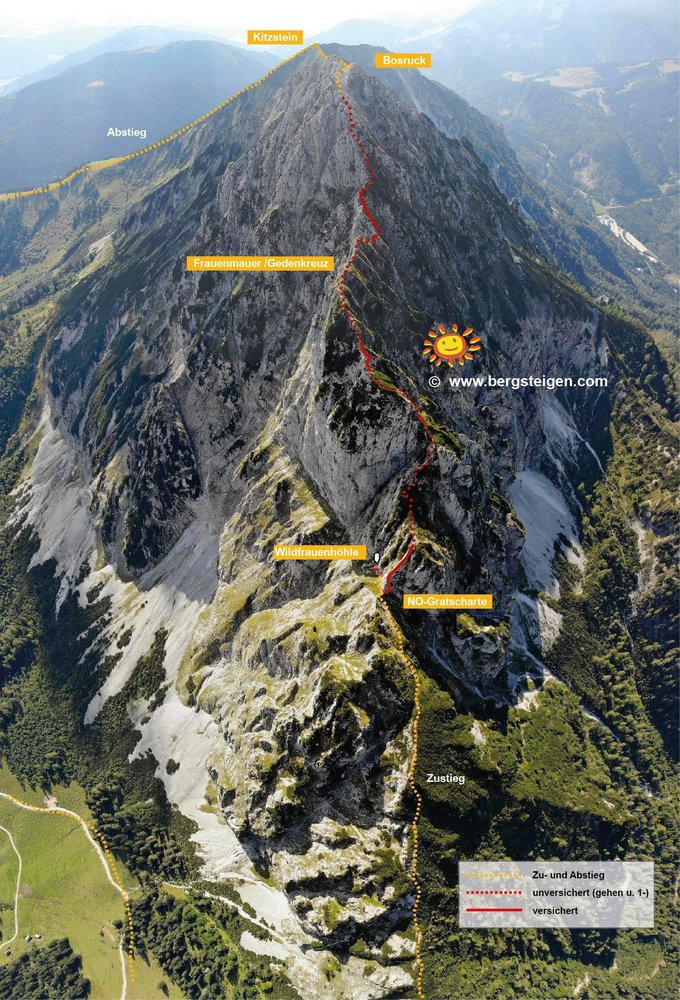 Von der NO-Gratscharte sehr luftig und ausgesetzt am Grat empor (Stahlseil; B/C) bis zu einem Gratabsatz. Am folgenden Gratturm rechts vorbei und dahinter auf schmalem Grat (A) auf eine Schulter. Dann auf dem gestuften Grat zum Gipfel der Frauenmauer. Nordseitig absteigend (A/B) in eine Scharte, weiter auf kurzem schmalen Grat, danach über ein gestuftes Steilstück empor. Über Schrofenhänge und Rinnen aufwärts und auf dem breiten Grat im Rechtsbogen auf