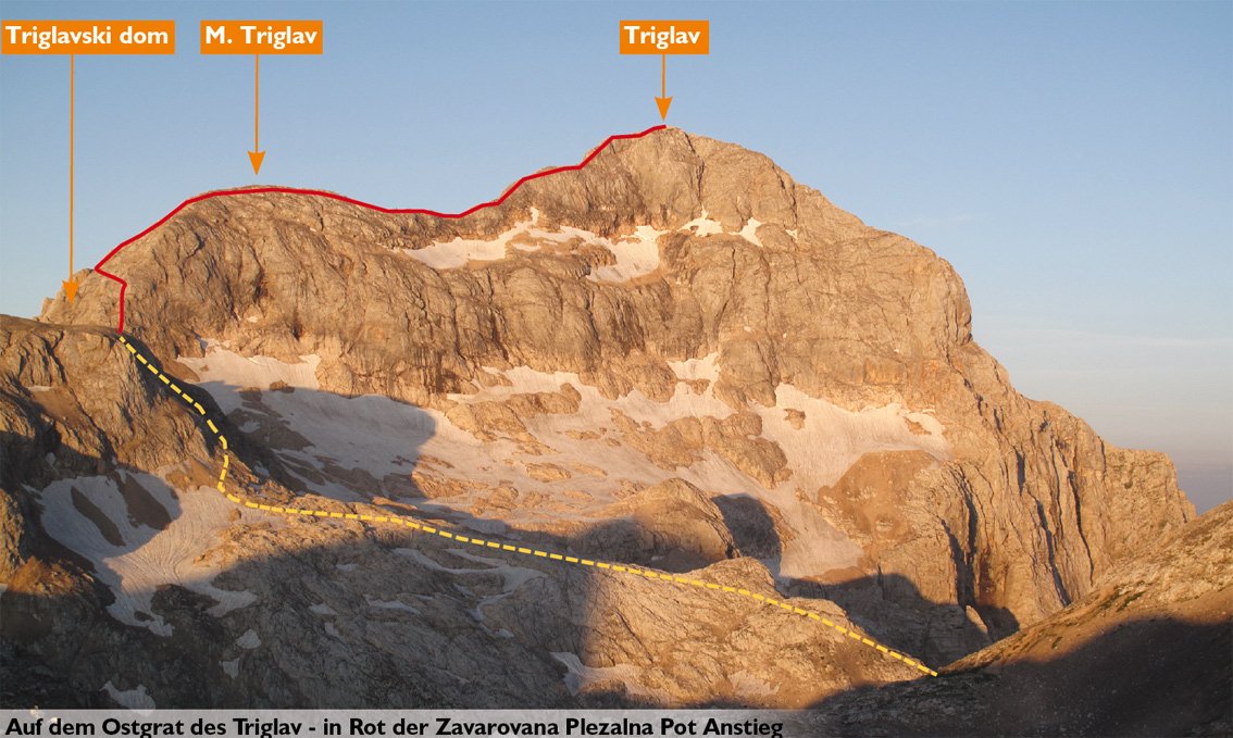 Von Osten (Prag-Weg und Tominškova Pot): Vom Einstieg in südlicher Richtung auf geschlagenen Stufen und Trittstiften (A) zum M. Triglav hinauf, kurz davor links die Abzweigung zur Dom Planika. Vom Gipfel kurz absteigen und weiter über den glatt polierten Ostgrat (A, Stellen A/B) zum Hauptgipfel. Ca. 50 m davor ist eine Biwakhöhle, der sog. „Stanic Unterstand“. Der gesamte Aufstieg ist ausreichend versichert -„Stachelschwein“ (1-1 ½ Std. vom Triglavski Dom).