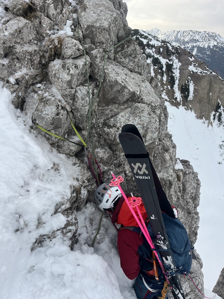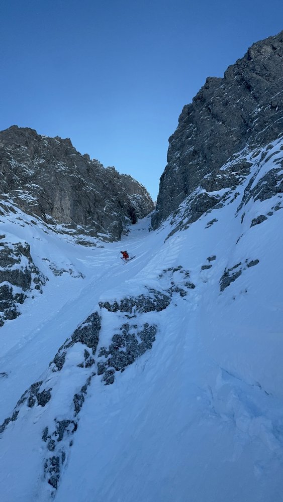 Sehr anspruchsvolle, extrem steile Rinne von den Handschuhspitzen ins s'Bergle runter. Komplettiert (04/2025) das Quartett aus Y-Couloir, Haselehn-Rinne und Direkter Nordrinne.