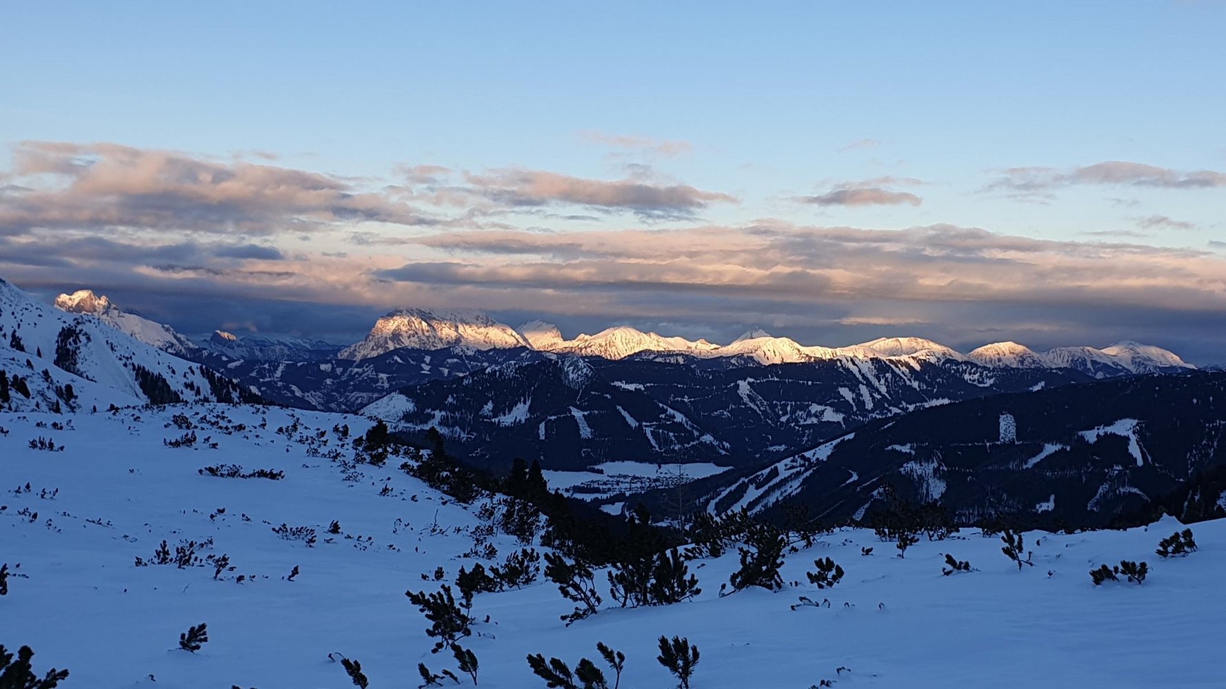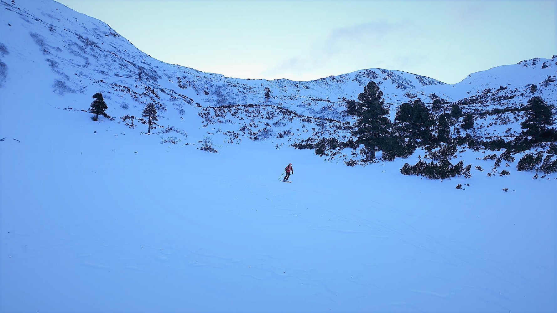 Die Gipfelflanke braucht ganz sichere Lawinenbedingungen. Nach dem Gipfelhang kann man noch gut den Schüttnerkogel anhängen. So kommt man auf 1500 Hm.