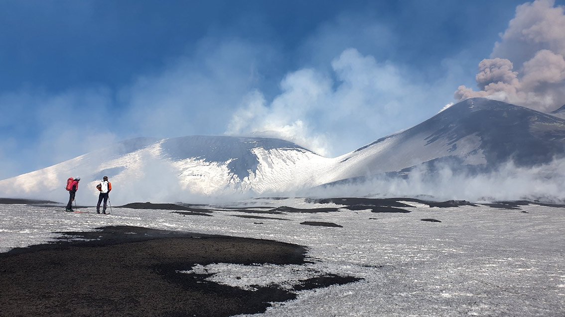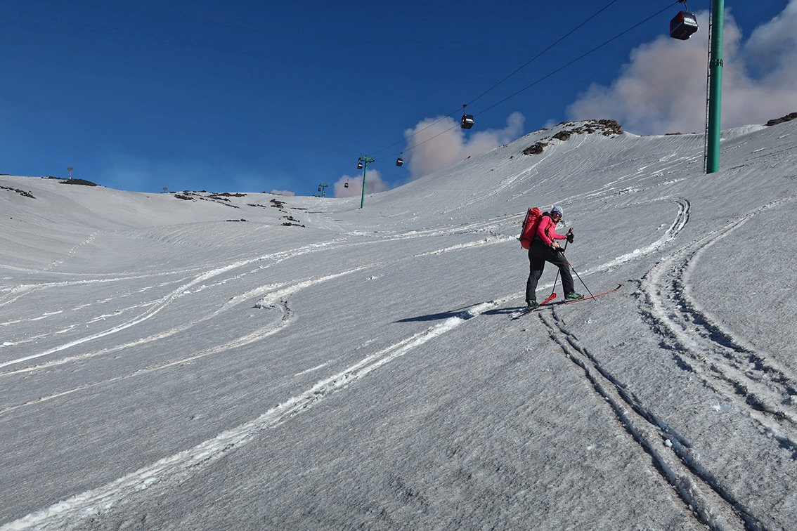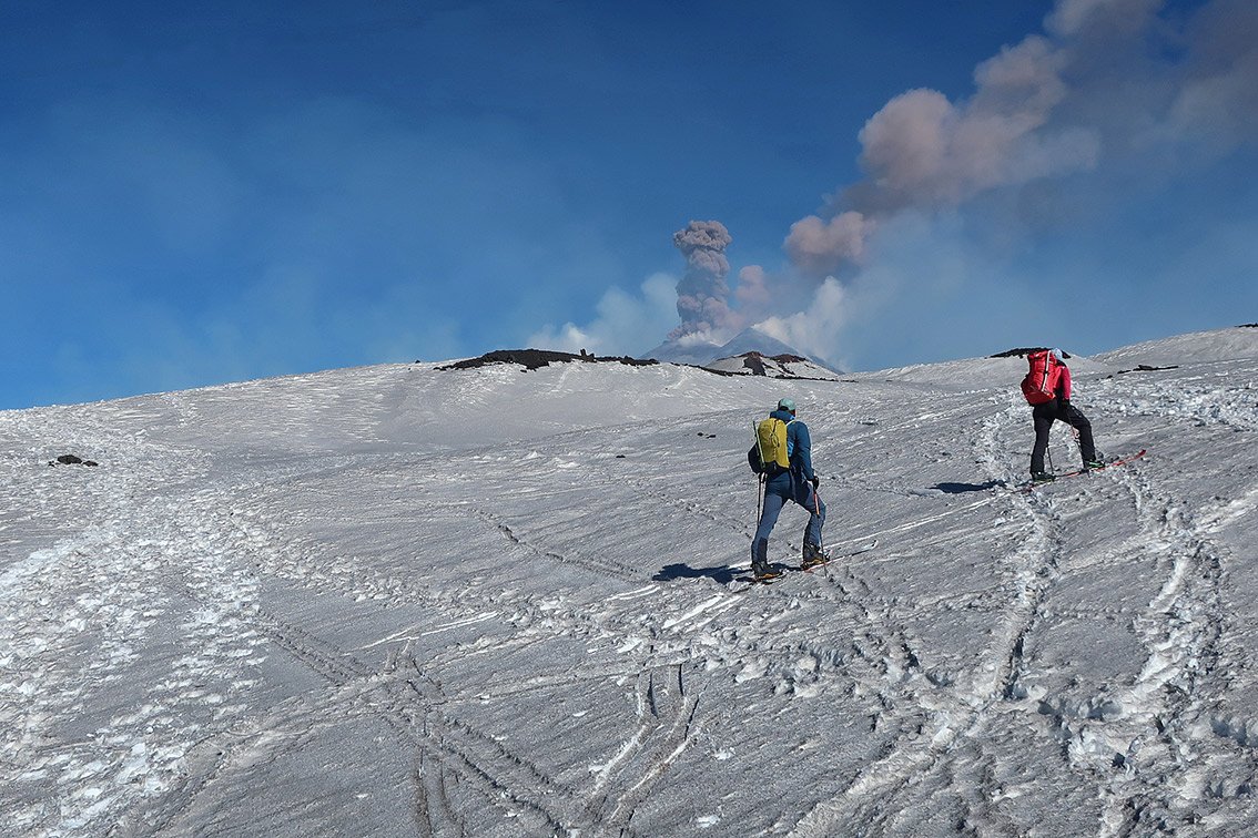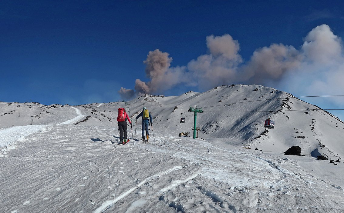 Der Etna ist ein aktiver Vulkan, der aktuell sogar immer höher wird. Die Tourenziele sind der Nord-Ostkrater und der Südkrater. Man informiert sich am besten vorher über die Verhältnisse. Auf etnasci.it gibt es gute Webcams (Parkplatz Etna Nord, Parkplatz Etna Süd). Skibetrieb meist nur im Etna Nord Skigebiet, an der Südseite läuft nur die Gondelbahn (Pisten sind meist nicht präpariert).