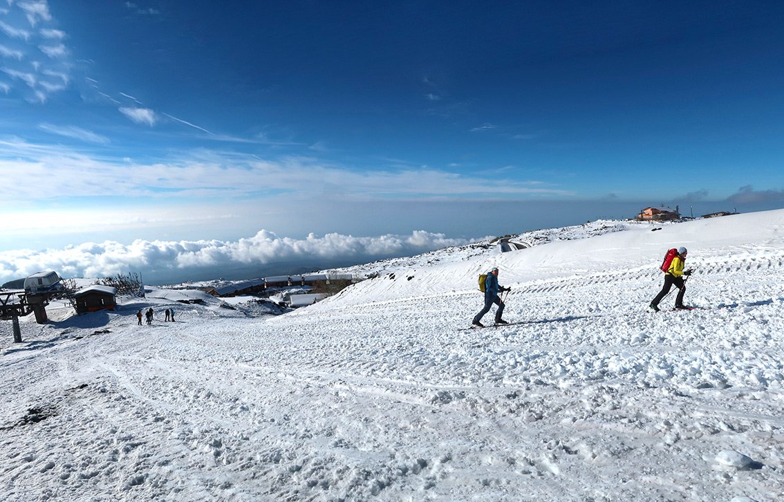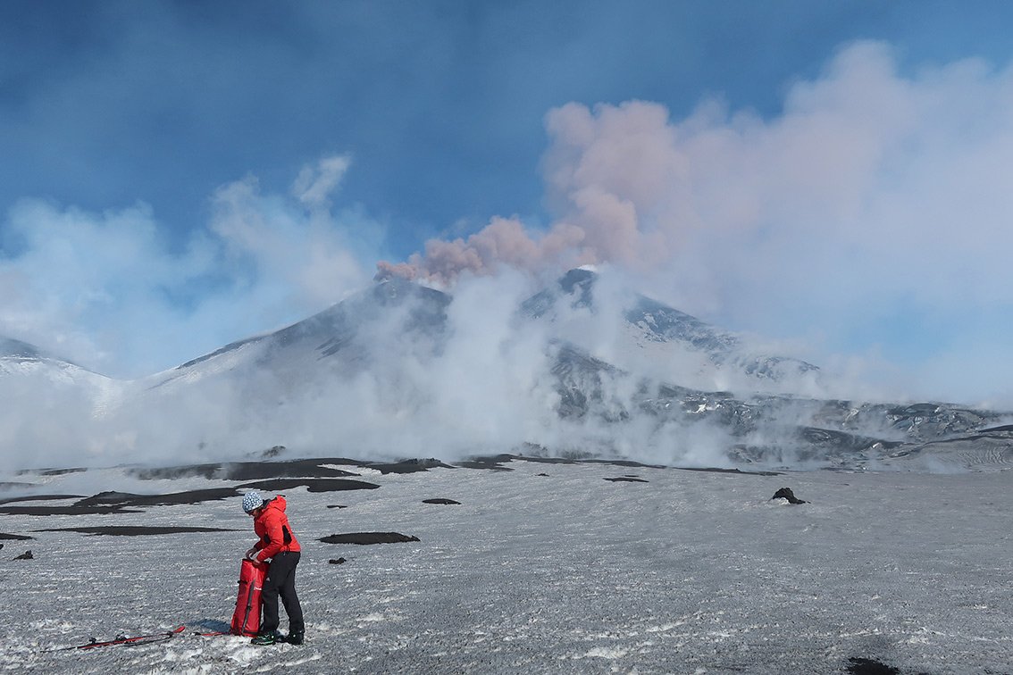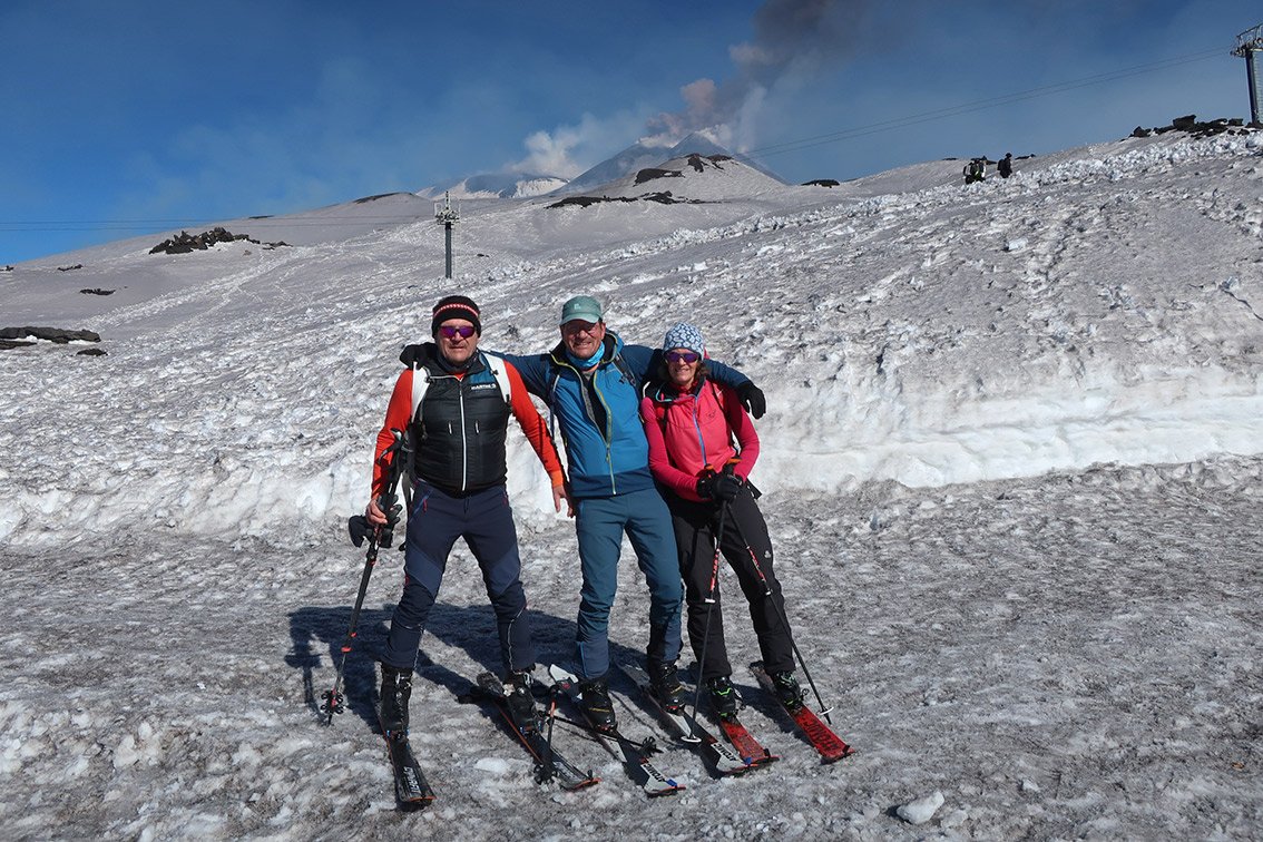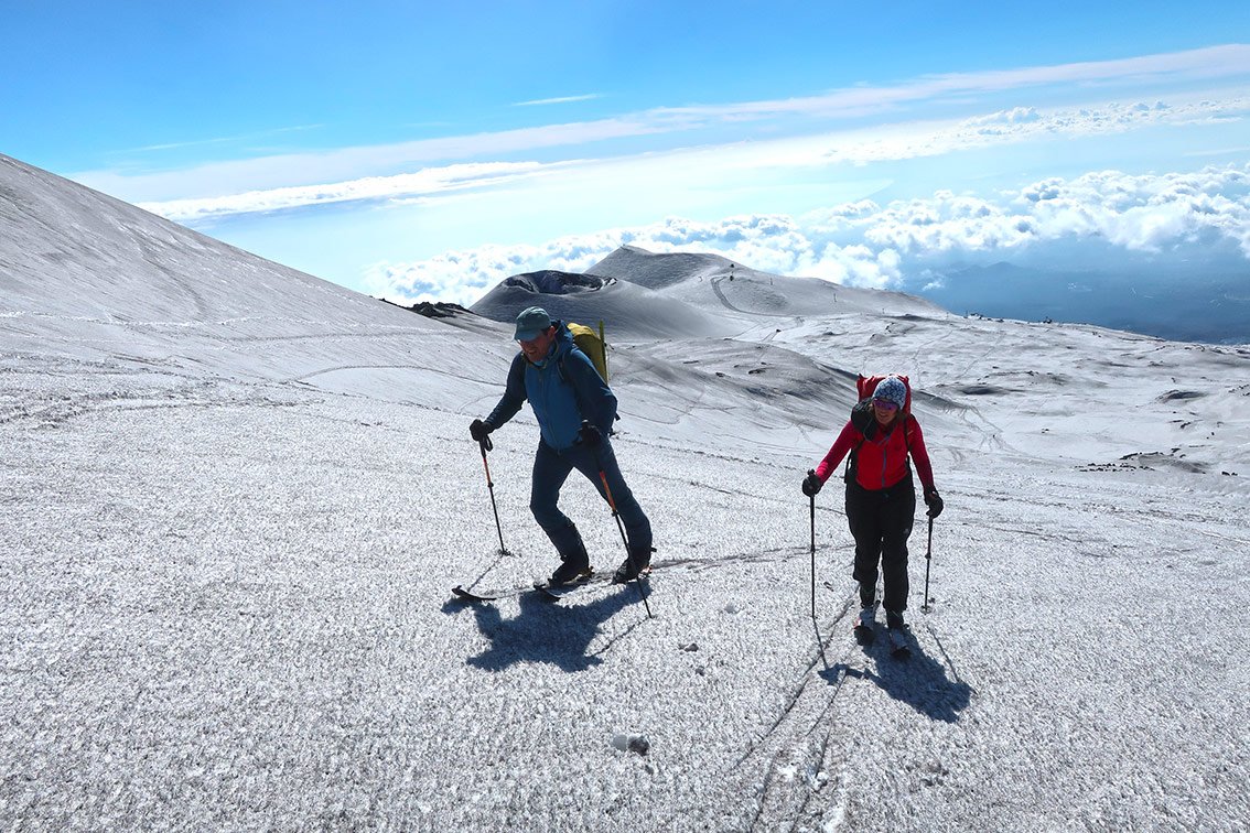 Der Etna ist ein aktiver Vulkan, der aktuell sogar immer höher wird. Die Tourenziele sind der Nord-Ostkrater und der Südkrater. Man informiert sich am besten vorher über die Verhältnisse. Auf etnasci.it gibt es gute Webcams (Parkplatz Etna Nord, Parkplatz Etna Süd). Skibetrieb meist nur im Etna Nord Skigebiet, an der Südseite läuft nur die Gondelbahn (Pisten sind meist nicht präpariert).