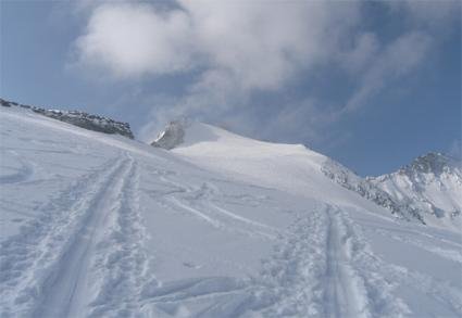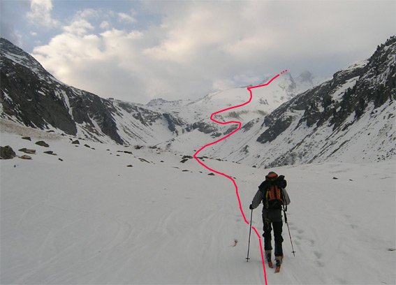 Vom Gasthof Finkau dem Weg in Richtung Zittauerhütte folgen - es führt eine Fahrstraße bis zum Materialaufzug. Beim Materialaufzug gerade (bzw. ganz leicht rechts) über die Steilstufe (Vorsicht oft Blankeisstellen) und dann wieder nach links in Richtung Zittauerhütte, um die markante Moräne herum bis man links neben der Moräne in einen Graben kommt. Diesen direkt aufsteigen und oben leicht linkshaltend bis zu den Felsen und diesen entlang bis zu einer Art Scharte. Nun - meist in Felsennähe - über das letzte Steilstück (die sog. Glatze - kann bei wenig Schnee bzw. hartem Harsch heikel sein) bis zum Beginn des Felsgrates, hier Skidepot. Nun Anfangs meist rechts vom Grat aufwärts, am Ende kommt ein sehr ausgesetztes Gratstück kurz vor dem höchsten Punkt (Felsgrat II - kann bei Vereisung heikel sein! Viele Gablergeher gehen nur bis zum Skidepot).
