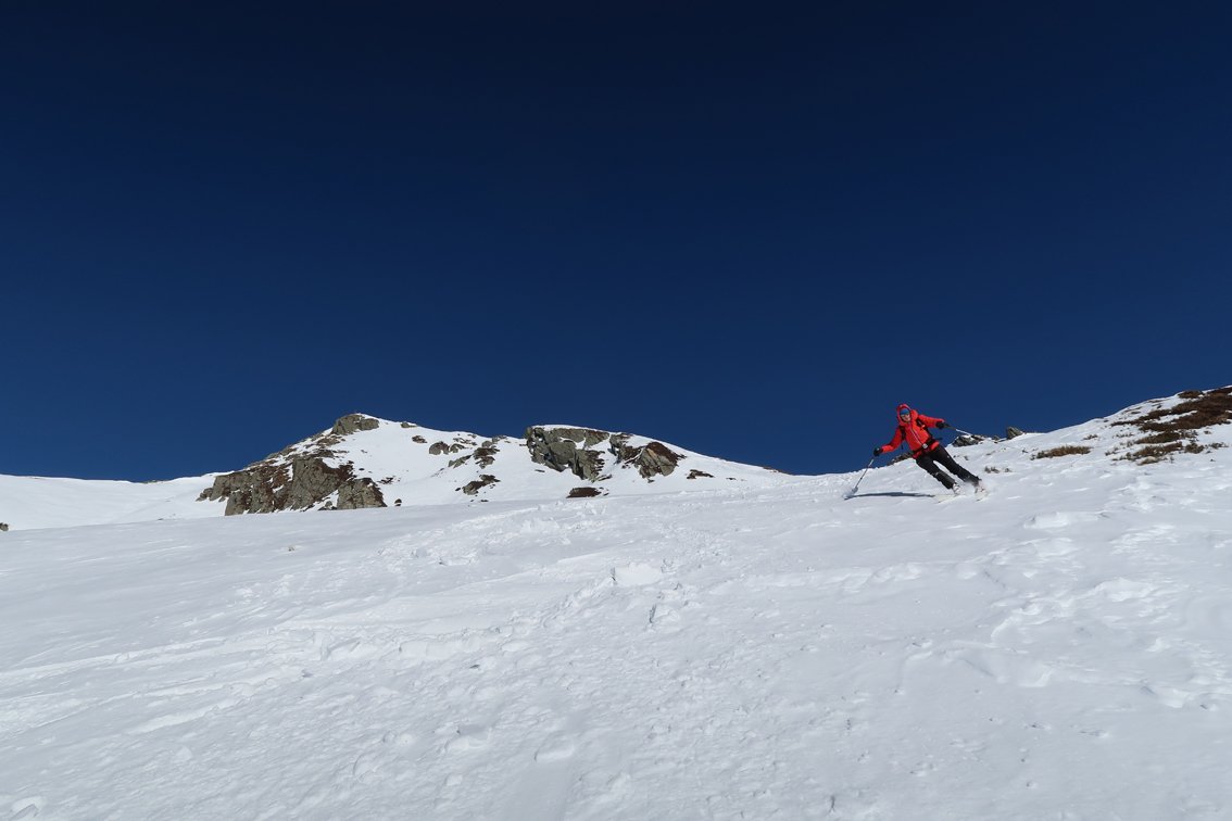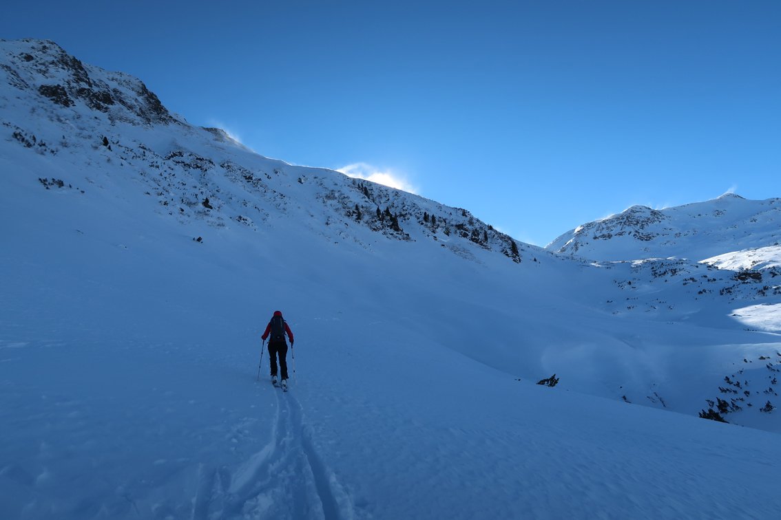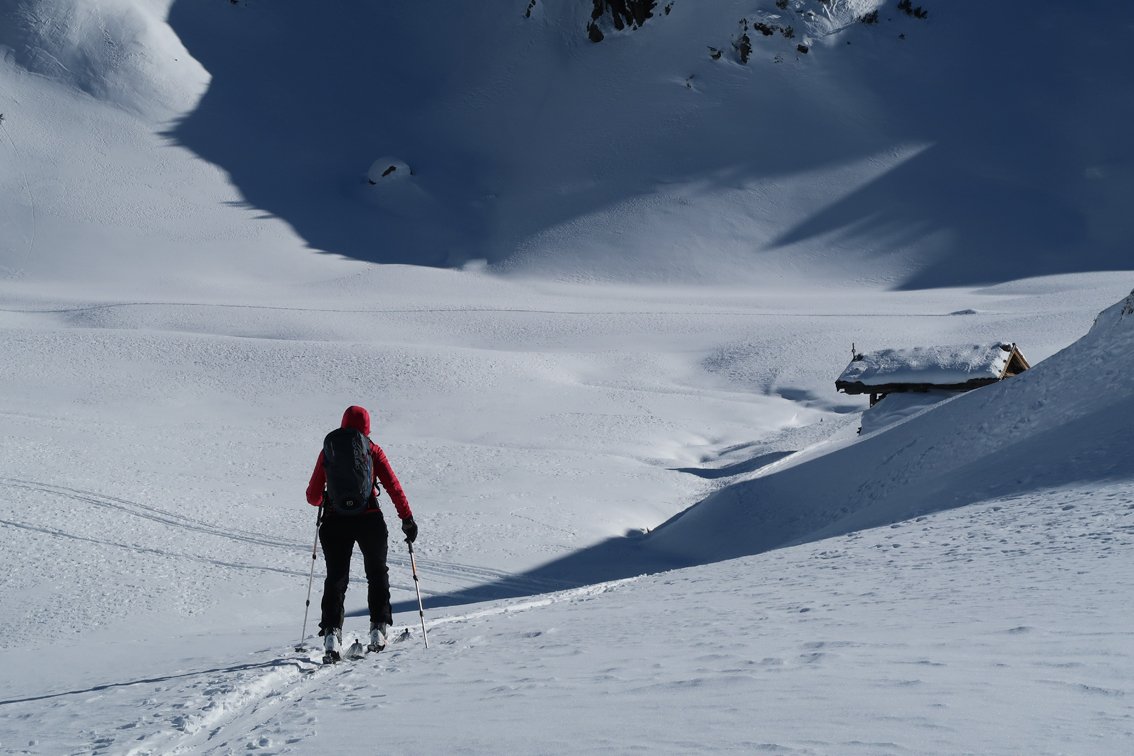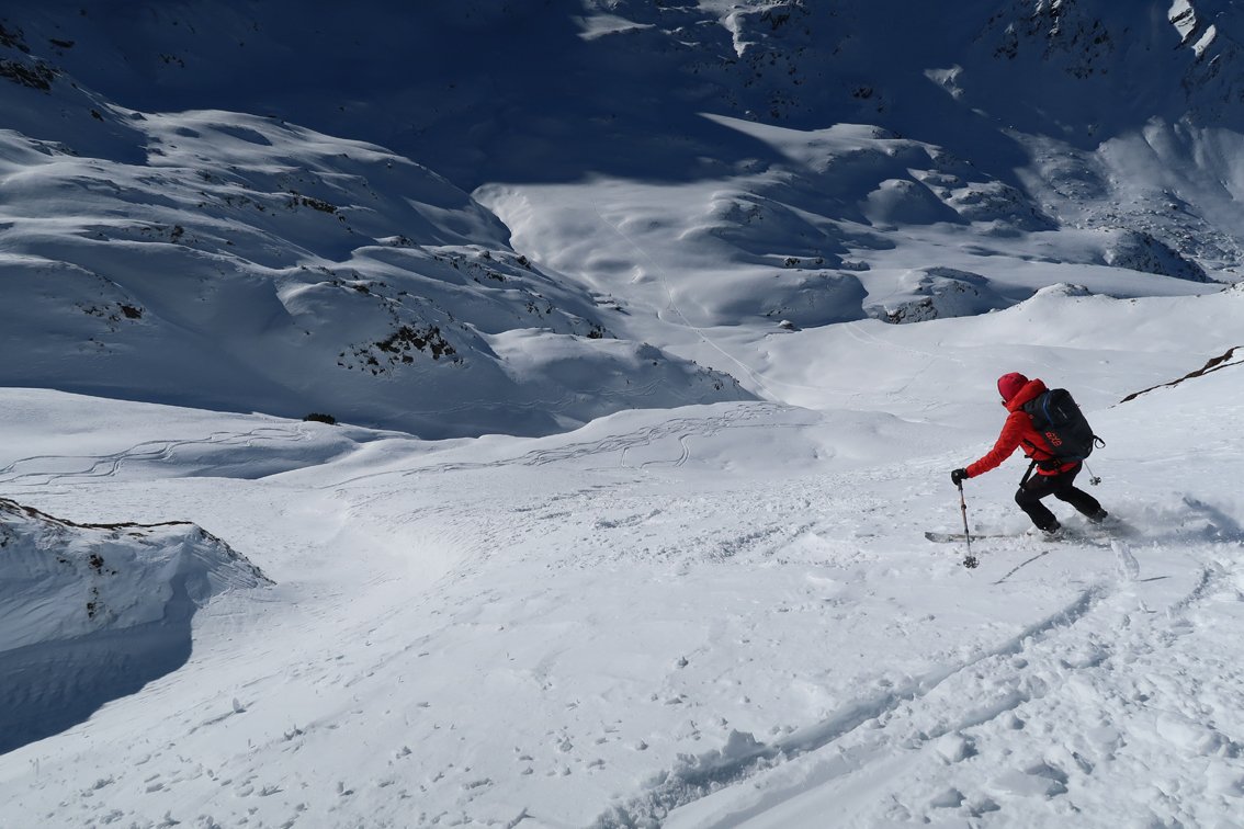 Abfahrt bis ins Becken mit den verfallen Almhütten. Wer nicht zum Gamskogel aufsteigt, fährt entlang der Aufstiegsspur ins Tal (einige kurze Gegenanstiege).