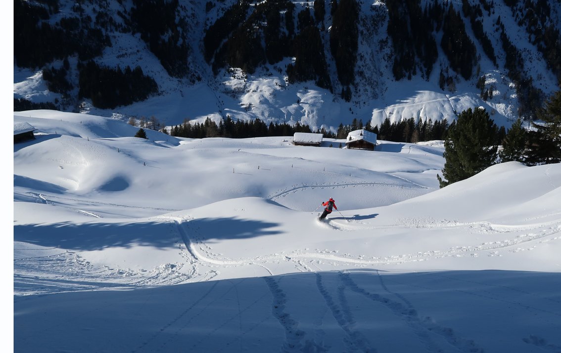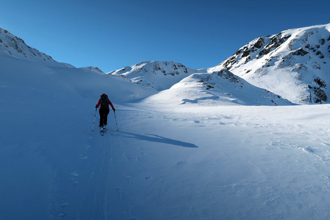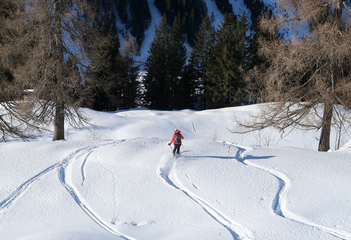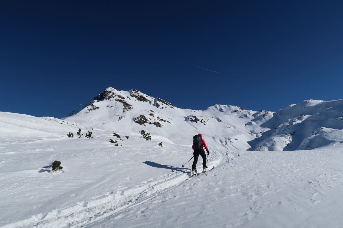 Abfahrt bis ins Becken mit den verfallen Almhütten. Wer nicht zum Gamskogel aufsteigt, fährt entlang der Aufstiegsspur ins Tal (einige kurze Gegenanstiege).