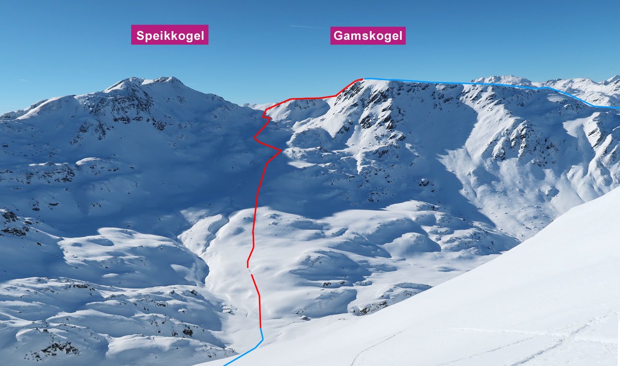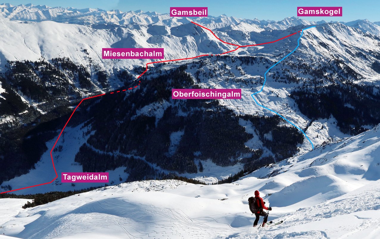Abfahrt Gamskogel: Immer leicht links vom breiten Kamm hinunter bis zur Oberfoischingalm und von dort hinunter zur Unterfoischingalm. Von dieser in den Talgrund und auf dem Fahrweg zurück zum Parkplatz beim Gh. Steinberghaus. Nur bei sehr sicheren Verhältnissen kann man die steile Westflanke zur Filzenscharte abfahren - muss aber kurz über die Scharte tretteln.