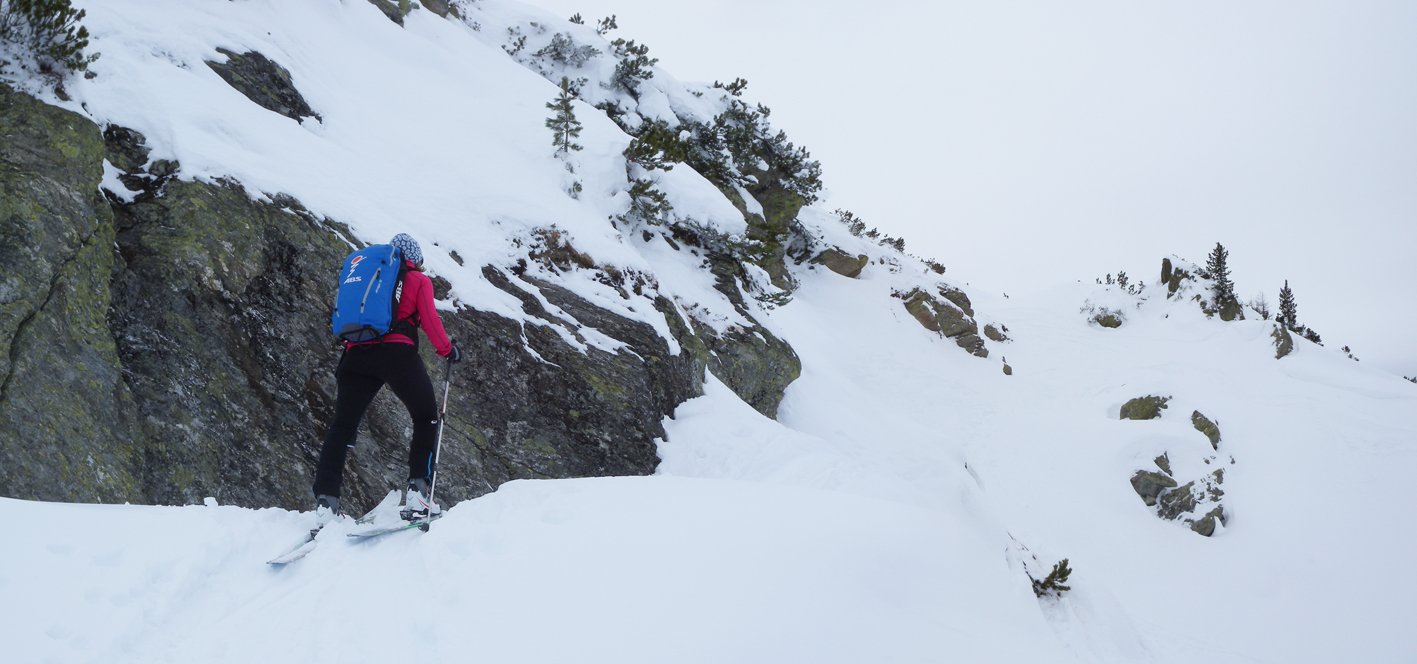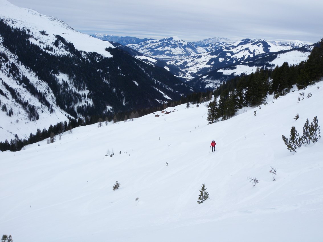 Die östliche Abfahrt ist ohne Spuren nicht leicht zu finden, am sichersten fährt man auf der Aufstiegsroute (Foischingalmen) ab.