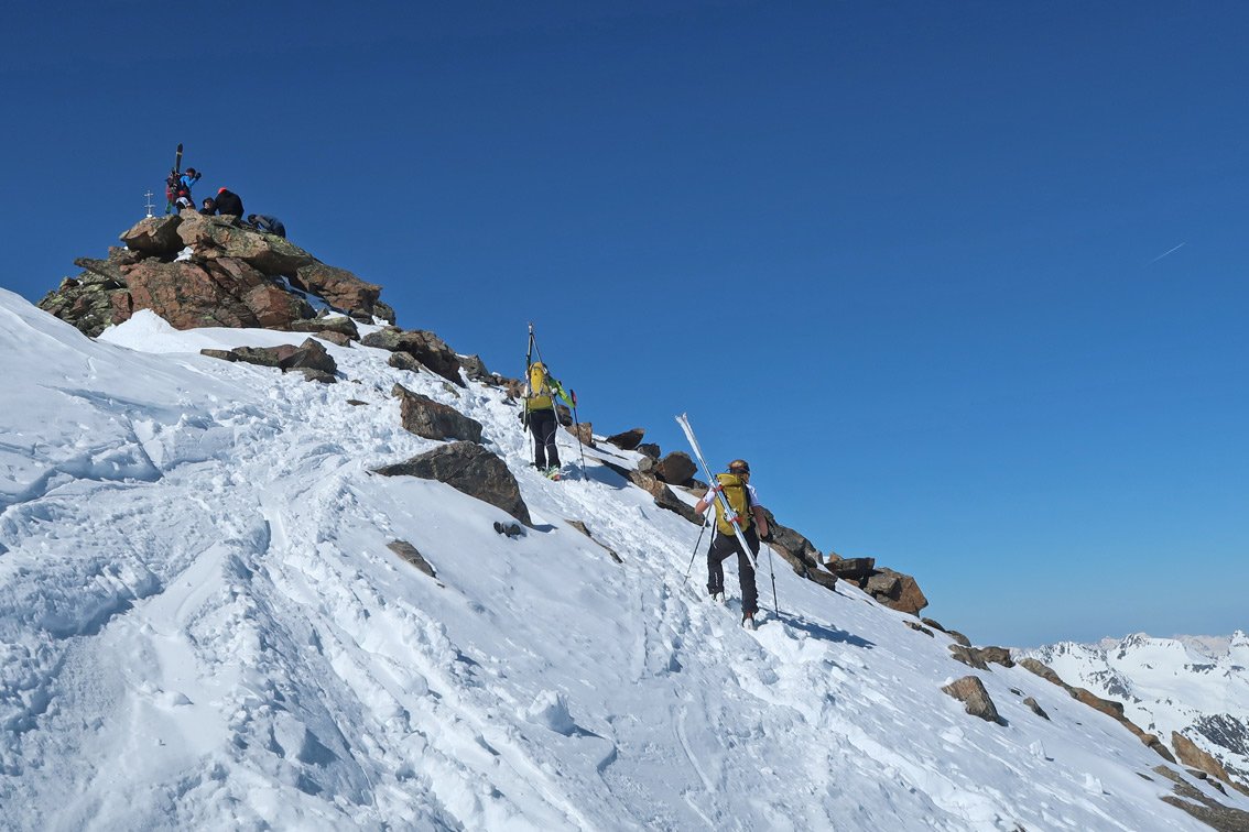 Bei hartem Firn lässt man die Skier vor der steilen Rinne stehen und steigt mit Steigeisen zum Gleirscher Fernerkogel auf (bei guten Verhältnissen die Skier aber mitnehmen). Die Tour nur bei sicheren Schneeverhältnissen durchführen! Man kann diese Tour natürlich mit dem Snowboard machen - das lange Tal ist aber sehr flach und man wird vor allem im unteren Teil der Abfahrt keine Freude haben.