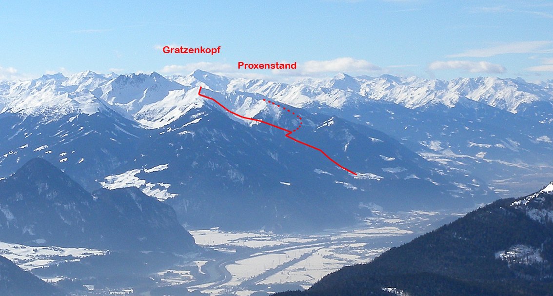 Alternativroute. Von der Schwaderalm (oder besser schon vorher auf dem Forstweg den Spuren rechts folgen) hinauf zum Proxenstand und auf dem Grat zum Gratzenkopf (2087 m).