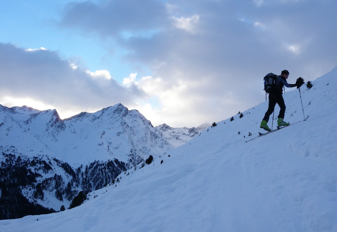 Abfahrt im Bereich der Aufstiegsspur. Alternativ kann man im Kühgrübl bzw. schon direkt vom Gipfel nach Praxmar abfahren. Auf ca. 2000 m nach rechts um den Rücken herum zum Ort.