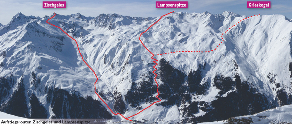 Schöne und im Gegensatz zur Lampsenspitze recht selten besuchte Tour. Gerade wenn sich an der Lampsen die Massen stauen, empfiehlt sich ab der Koglhütte der Abstecher nach rechts zum Grieskogel. Der steile Gipfelhang kann durch die Spurwahl im Bereich des Grates etwas entschärft werden. Bei sicheren Verhältnissen tolle Abfahrt direkt hinunter nach Praxmar.
