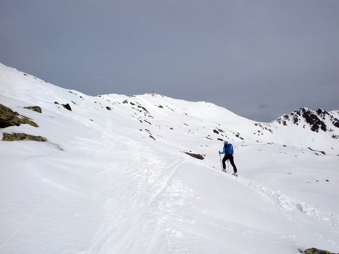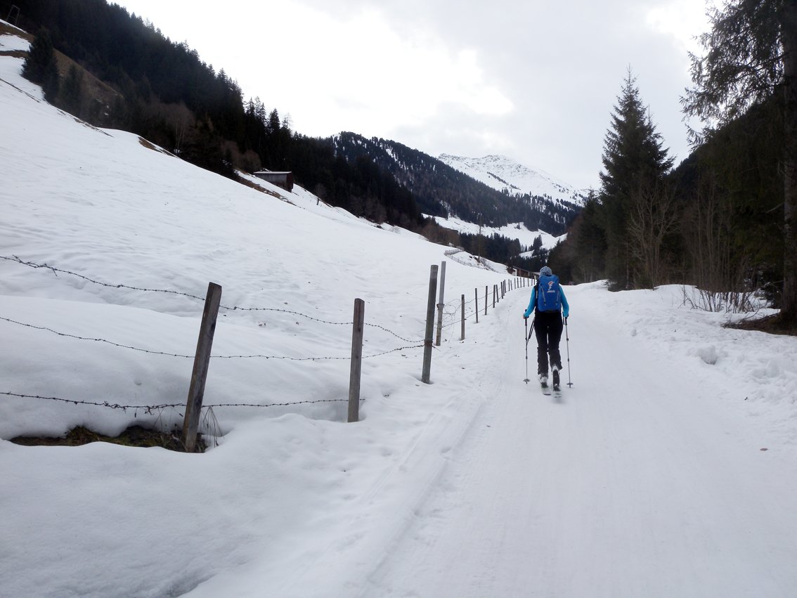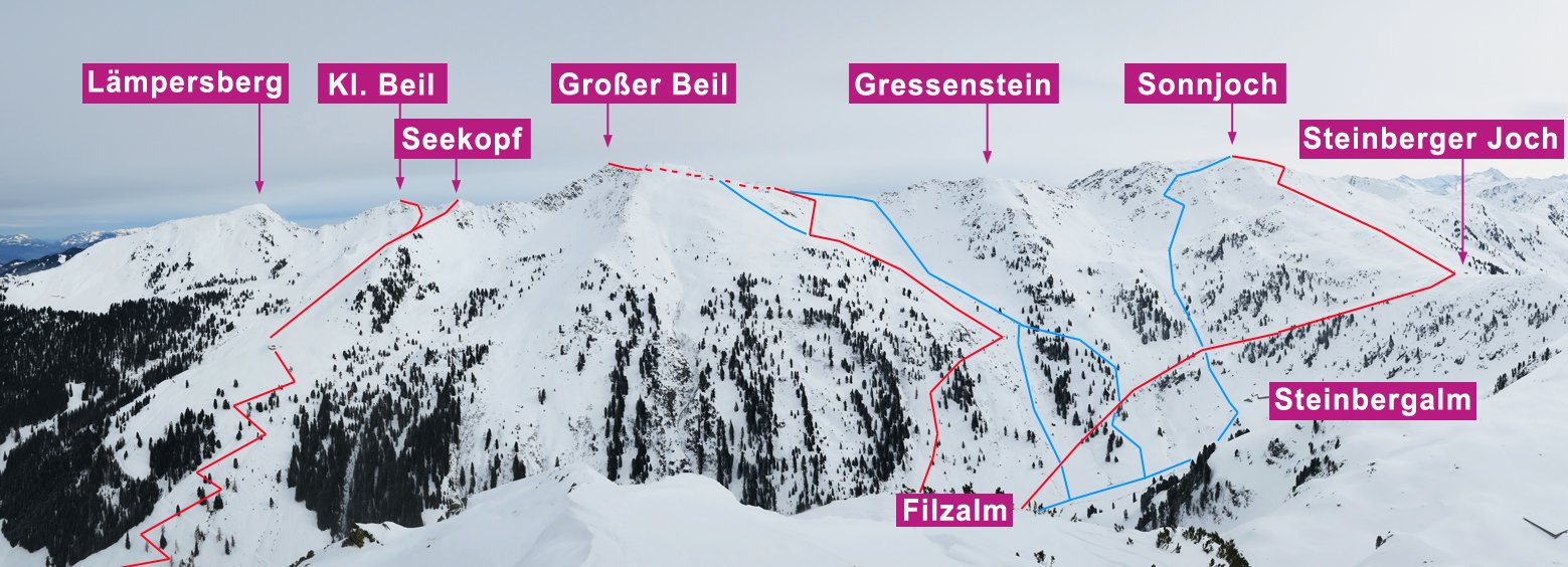 Abfahrt wie Aufstieg. Alternativ kann man auf dem Kamm bis zur markanten Scharte unterhalb des Gressensteins fahren, dort dann westlich hinunter zur Filzalm (meist ist dort der Pulverschnee etwas besser).