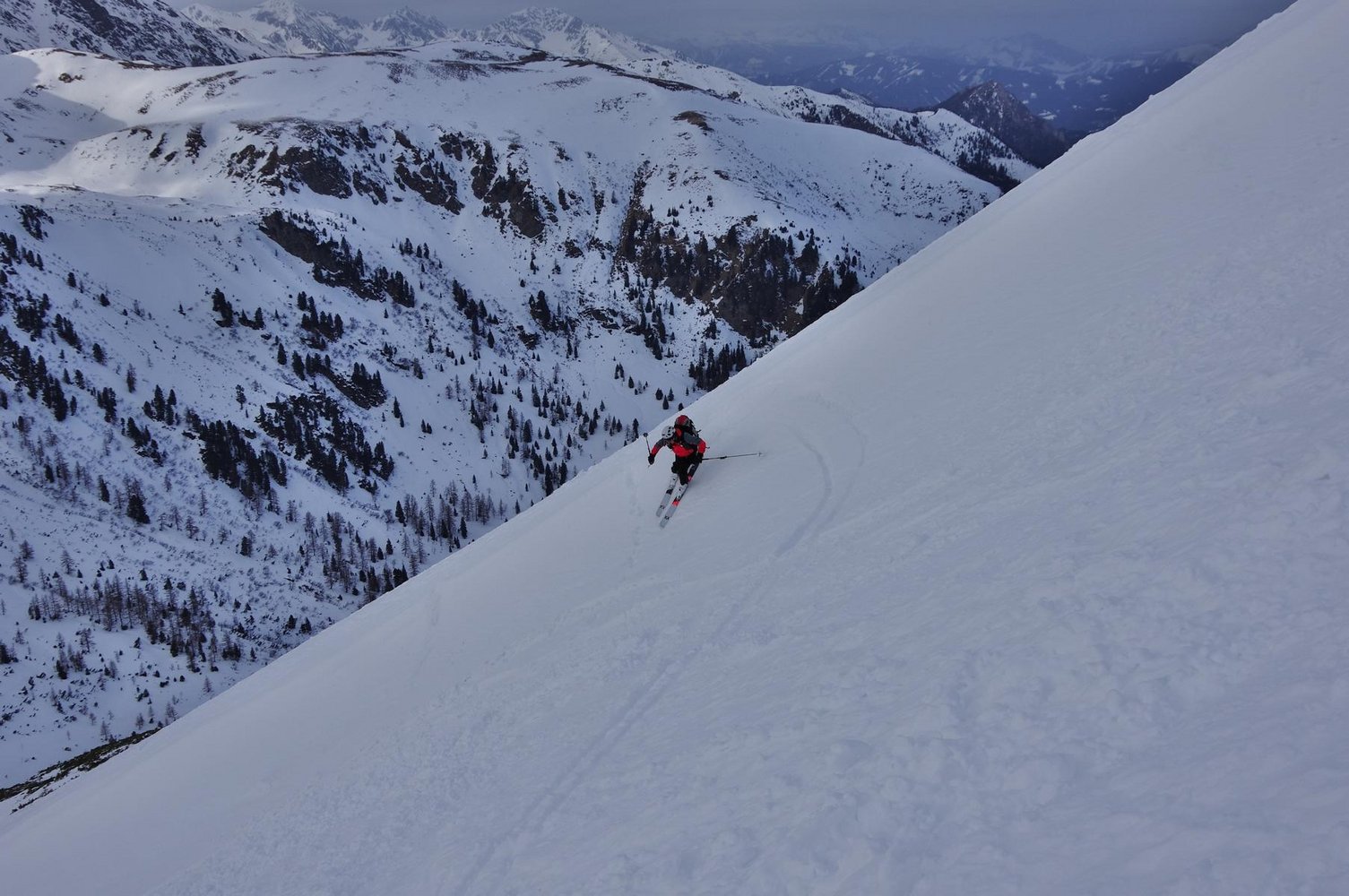 Die Abfahrt erfolgt entsprechend der Aufstiegsspur bzw. kann bei entsprechenden Verhältnissen (Firn) ein Flanke auf der Südseite abgefahren werden und nach rechts zum Triebener Törl gequert werden.