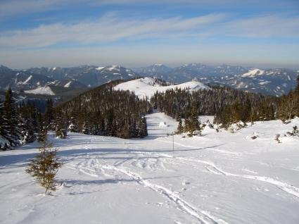 a) Von der Bergstation 500 Hm: Auf Weg zu Ottohaus und kurz vor der Hütte (am sog. Praterstern) rechts über flache Almböden Richtung Dirnbacherhütte und Lechnermauern. Von der Hütte erfolgt ein kurzer Anstieg hinauf zum Klobentörl. Von hier entweder direkt hinauf zu Scheibwaldhöhe oder zur Gloggnitzerhütte u. links (Schilder) in den Kesselgraben abfahren, den man bis zur Höllentalbundsstr. folgt.