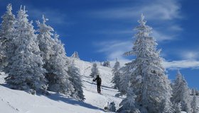 Abfahrt: Vom Gipfel entlang der Aufstiegsspur zum See und dann links durch lichten Wald hinunter. Am Ende der freien Fläche rechts in den flachen Rinnenauslauf queren. Nach einem kurzem Steilhang. Hier links zurück zur Aufstiegsspur.